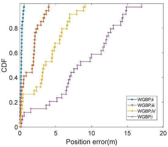As shown in Figure 13, experimental results demonstrate that the WGBP algorithm achieves the highest positioning accuracy: its position error remains bounded within 10 m throughout the test, with a mean (standard deviation) of 3.2 m (1.5 m) and a 95% percentile error of 4.8 m. These metrics are markedly superior to those of the HRGBP algorithm [mean (std): 5.7 m (2.1 m), 95% percentile: 7.9 m], the GBP algorithm [mean (std): 8.3 m (2.8 m), 95% percentile: 11.6 m], and the EKF algorithm [mean (std): 13.5 m (5.2 m), 95% percentile: 17.7 m]. Notably, EKF exhibits the poorest accuracy and largest error variability, with peak error reaching 26.3 m.