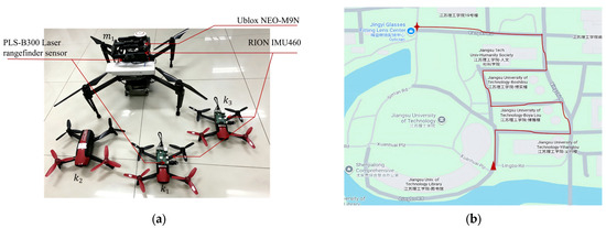 Field experiment configuration. (a) Mounted sensors; (b) Formation flight trajectory.