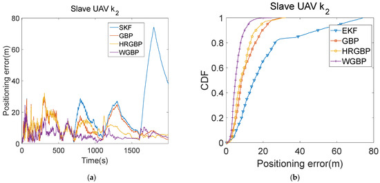 As shown in Figure 15, slave UAV k2 was arranged on the right side of the formation, where dynamic occlusion by pedestrians and vehicles was frequent, posing great challenges to the algorithm’s adaptability to intermittent observation loss. The EKF algorithm was highly sensitive to dynamic occlusion, resulting in drastic error jumps and extremely poor robustness. In contrast, the WGBP algorithm had strong fault tolerance for intermittent data loss and maintained reliable positioning relying on its optimized data fusion strategy [mean (SD): 15.1 m (4.0 m), 95th percentile error: 19.9 m], which was superior to the HRGBP algorithm and GBP algorithm in adaptability to dynamic complex environments.