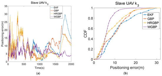 As shown in Figure 16, slave UAV k3 was deployed at the rear side of the formation, responsible for ensuring long-term trajectory consistency, and thus had strict requirements on algorithm stability. After 1100 s, the experiment entered a dense building area; due to poor long-term stability, the positioning error of the EKF algorithm continued to accumulate and deteriorate. The WGBP algorithm maintained stable convergence throughout the 2000 s mission, with error always ≤10 m [mean (SD): 3.3 m (1.6 m), 95th percentile error: 4.9 m], showing better long-term reliability compared with the HRGBP algorithm and GBP algorithm, whose stability significantly decreased in long-duration complex tasks.
