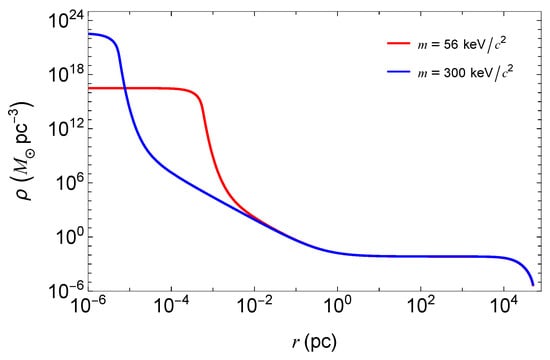 With the distribution function specified, the profile of the DM density (and other thermodynamic variables, e.g., pressure, chemical potential, etc.) is obtained from the numerical integration of the Einstein equations in spherical symmetry. The energy-momentum tensor is that of a perfect fluid (the DM gas). The system of equations is supplied by the thermodynamic equilibrium conditions of the spatial constancy of the temperature and chemical potential measured by an observer at rest at infinity, i.e., the gravitationally redshifted local temperature and chemical potential [33,34]. The general DM density profile is characterized by a dense core in which degenerate Fermi gas properties dominate, followed by a Boltzmannian, dilute outer halo. Given a fermion mass, the system of equations is solved for specific astrophysical boundary conditions, e.g., to fit the total mass of the Galaxy and the rotation curve. We refer to [34] for the Milky Way and to [42] for other galaxy types.