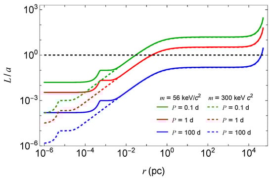 Ratio of the estimated wake size L to the orbital separation a, as a function of the distance to the source from the Galactic center, for selected orbital periods , 1, and 100 days, and for and . The plot shows the result for the two DM fermion masses keV and keV . The black dashed line represents the ratio equal to unity.