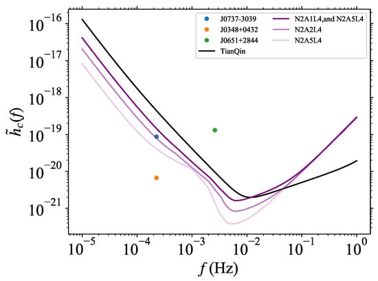 Reduced characteristic amplitude for the NS-NS, NS-WD, and WD-WD prototypes used in this work, shown in Table 1. The noise amplitude spectral density of LISA curves is shown as purple continuous lines, for three different geometrical arrangements of the interferometer [60]. The amplitude spectral density of the TianQin project detector is shown as a black continuous curve.