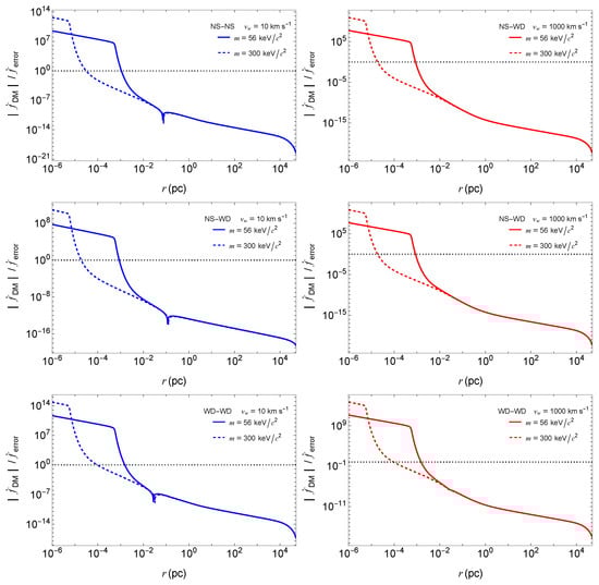 for the prototypical NS-NS (J0737-3039 like, top row), NS-WD (J0348+0432 like, middle row), and WD-WD (J0651+2844 like, bottom row), as a function of the location in the Galaxy. The binary parameters of J0737-3039, J0348+0432, and J0651+2844, including the value of , are given in Table 1. The black-dotted horizontal line shows the ratio equal to unity, so the cut of the curves with that line marks the distance to the source (from the Galactic center) up to which we expect the DM dynamical friction contribution in these systems to be measurable by LISA.