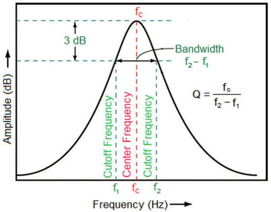 The Q factor is normally estimated from the ratio of the resonant frequency to the bandwidth at a 3 dB decrease in the frequency response, as shown in Figure 2. The advantage of solving the eigenvalue problem is that the Q factor of the open cavity is calculated using the complex eigenvalue ko as follows: