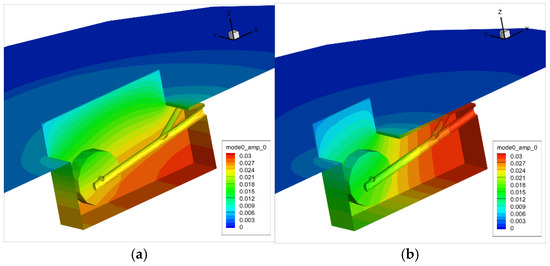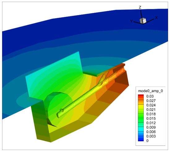The two aft doors are typically sealed with axial joints to maintain an aerodynamic profile. This section investigates the use of a longitudinal gap between these doors as a potential means to vent pressure buildup within the cavity. The results of the eigenvector analysis for an axial gap sized at 10% of the cavity width are presented in Figure 21. The contour shows clear acoustic radiation through the gap, accompanied by a 20% reduction in the maximum eigenvector amplitude. Notably, this amplitude is further reduced near the back door, a finding relevant for structural integrity at high Mach numbers. As the gap size increases up to 10%, the Q factor is nearly halved; however, as observed in Figure 22, this benefit follows a pattern of diminishing returns.