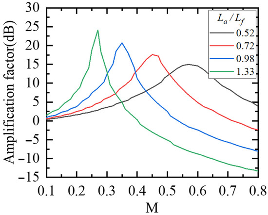 Amplification factor versus Mach number for different La/Lf (shorter aft doors).