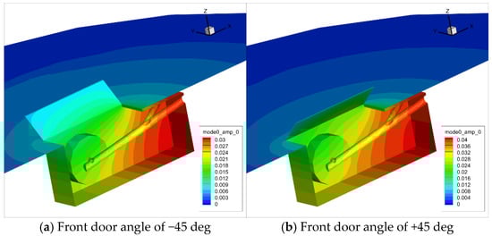 In this section, the influence of the front door angle is investigated across a range from −45° to +45°. While the physically achievable range for the door spans from 0° (fully closed) to approximately 90° (fully opened), the −45° position (further opening) represents an idealized state used primarily for sensitivity analysis. In contrast, the +45° position (more closing) corresponds to a realistic intermediate state encountered during the NLG deployment. Figure 17 displays the eigenvector amplitude for these two extreme angular positions. The amplitude for the +45° is 30% higher. The corresponding wave numbers and Q factors are presented in Figure 18. Opening the front door further to −45° enhances the system’s damping, reducing modal amplitudes and decreasing the Q factor from 5.62 to 4.64, approximately a 1.66 dB reduction. Conversely, closing the door to 45° reduces the damping, as anticipated, and increases the amplification factor by roughly 3 dB. Both the wave number and Q factor demonstrate a greater sensitivity to the closing angles (positive) than to the opening angles (negative). The observed decrease in wave number as the door is more closed indicates that resonance with the first Rossiter mode occurs at a lower Mach number. During the initial stage of NLG deployment (transitioning from state ‘a’ to ‘b’ as shown in Figure 1), the Q-factor is expected to drop sharply from its near-infinite value as the door begins to open, while the acoustic resonance frequency progressively increases.