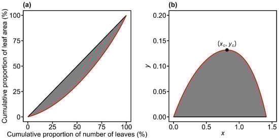 Illustration of the original Lorenz curve (red curve in panel a) and its rotated and right-shifted transformation (red curve in panel b) for leaf area distribution. In panel (a), the Lorenz curve plots the cumulative proportion of leaf area against the cumulative proportion of leaf number. In panel (b), the curve from (a) is rotated 135° counterclockwise around the origin and shifted rightward by units. The Gini coefficient is defined as twice the shaded area between the red curve and the line of equality in panel (a). The point of (xc, yc) is the maximum value point of the curve in panel (b). The Lorenz asymmetry coefficient is defined as .