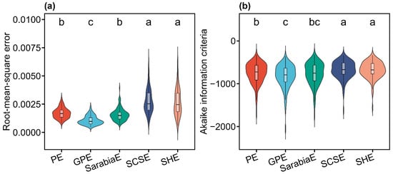 Violin plots showing the distribution of the root-mean-square error (a) and Akaike information criterion (b) values derived from the five Lorenz-based models (PE, GPE, SarabiaE, SCSE, and SHE). The horizontal bar within each box denotes medians; the bottoms and tops of boxes represent the 25th and 75th percentiles, and lines extend to the 1.5-fold interquartile range. Pairwise t-tests were conducted at the 0.05 significance level, with different letters indicating significant differences among models.