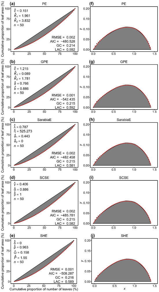 Comparison of the observed (closed circles) and predicted (red lines) data of the original Lorenz curve (a–e) and its rotated and right-shifted version (f–j) for a representative individual culm of Semiarundinaria densiflora. PE and GPE represent the performance equation and its generalized version, respectively. SarabiaE, SCSE, and SHE denote the Sarabia equation, the Sarabia–Castillo–Slottje equation, and the Sitthiyot–Holasut equation, respectively. Letters c, K1, K2, a, b, λ, η, a1, a2, γ, α, β, δ, ρ, ω, and P with hats represent the estimated values of the parameters of the corresponding equation in each panel. n represents the number of leaves on this individual culm; RMSE represents the root-mean-square error; AIC represents the Akaike information criterion; GC represents the Gini coefficient. LAC represents the Lorenz asymmetry coefficient.