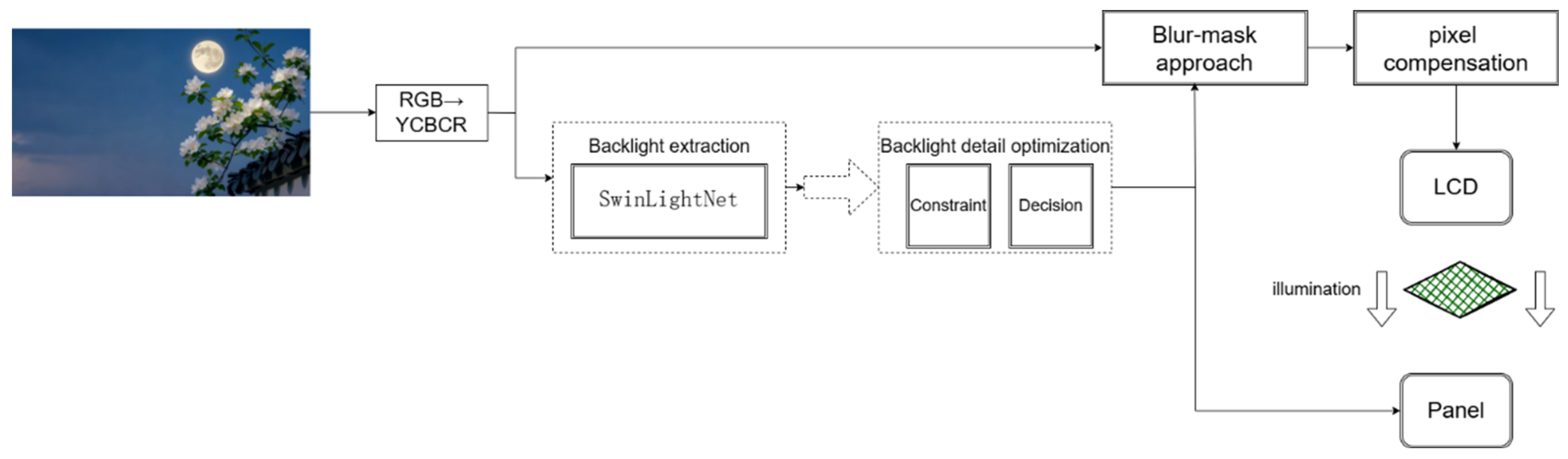 - Zheng, Y.; Wang, W. Lightweight CNN-Based Local Backlight Dimming for HDR Displays. In Proceedings of the 2025 37th Chinese Control and Decision Conference (CCDC); IEEE: New York, NY, USA, 2025; pp. 365–370. [Google Scholar] [CrossRef]