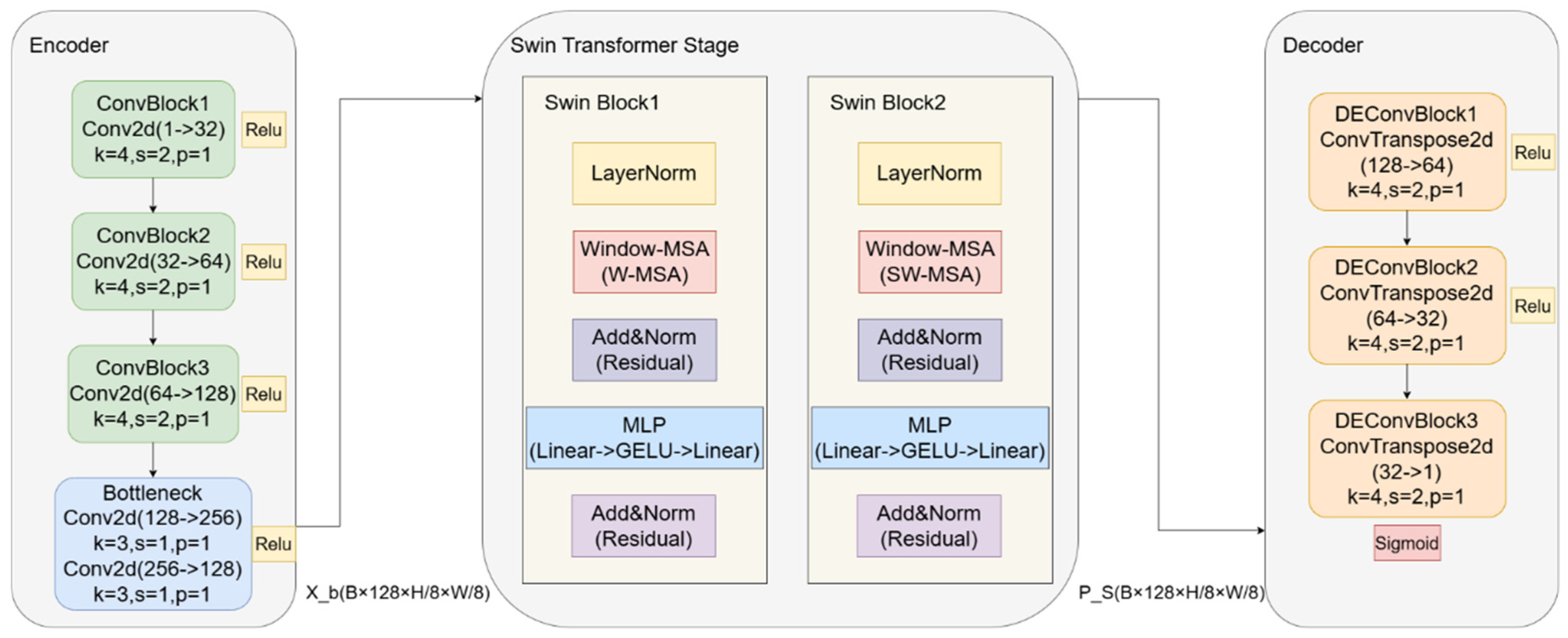 | Swin Stage | Swin Block 1 | W-MSA + MLP (ratio = 2.0) | 128 → 128 | 5 × 8 | Window attention | Swin Stage |