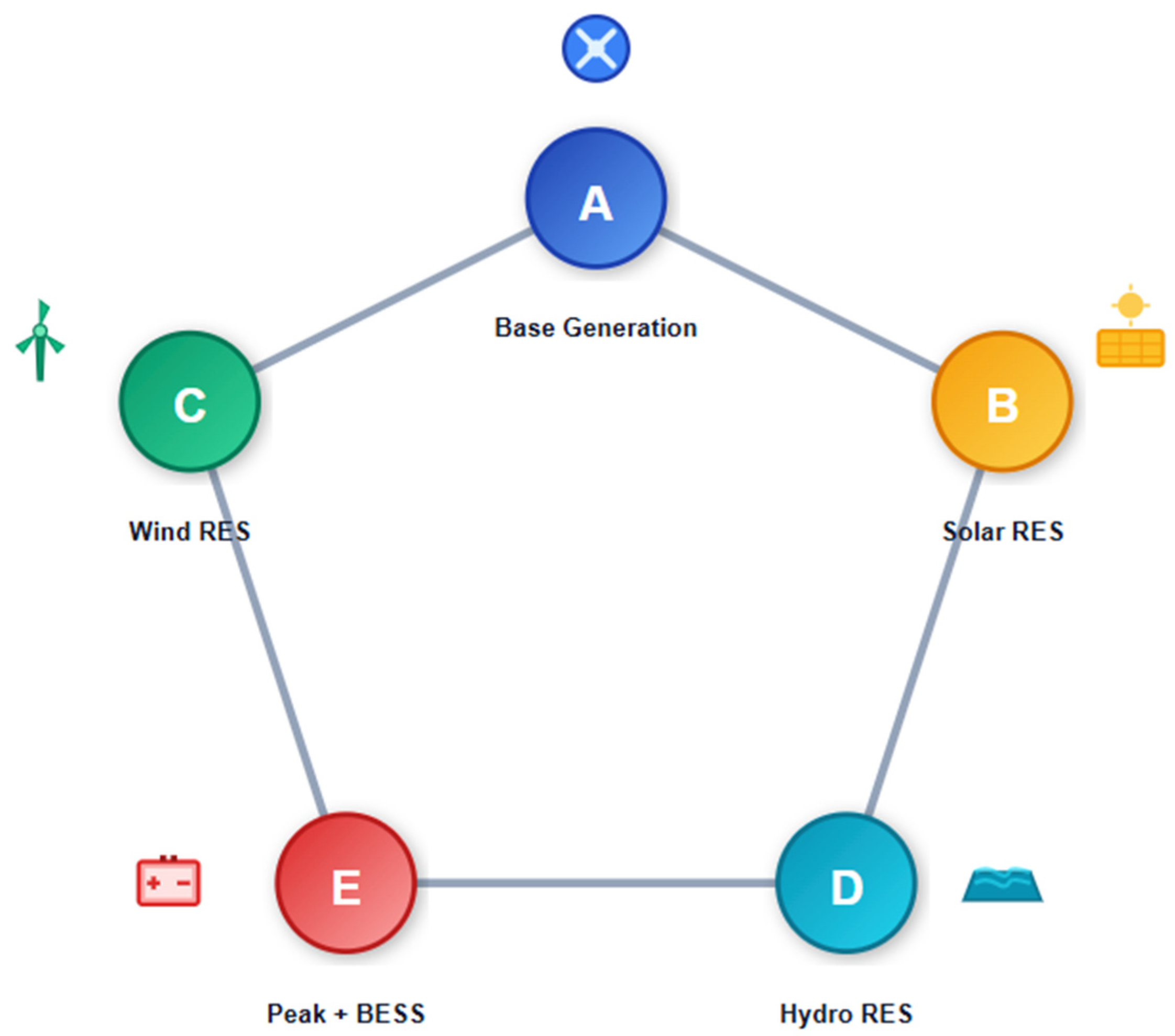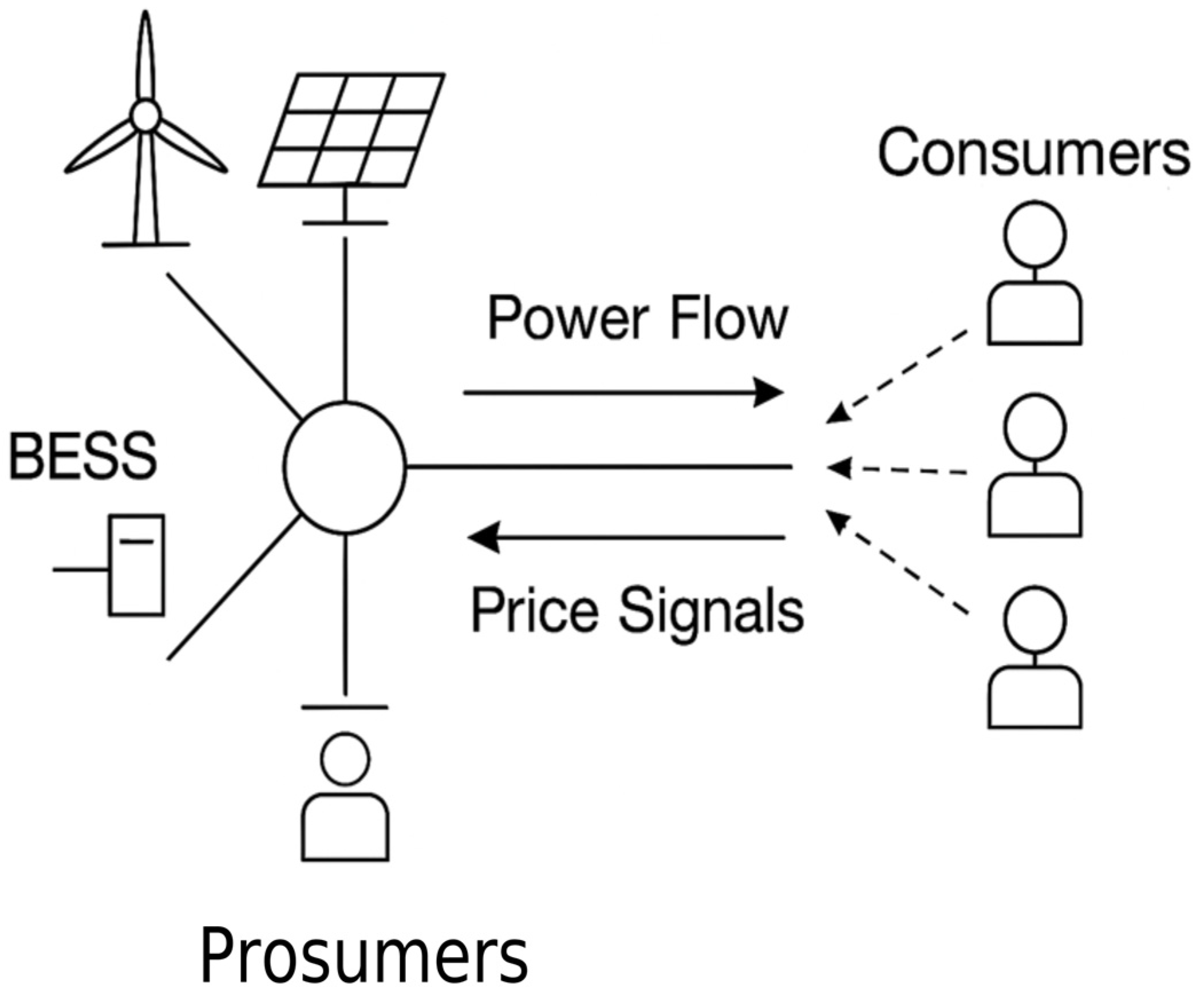 Figure 4 shows a conceptual diagram of a local electricity market with the integration of renewable energy sources and storage systems. The nodes of the diagram include generators, a BESS, and consumers, while the arrows represent both physical electricity flows and information signals related to pricing. Repeating elements form symmetrical clusters, which allows variables and constraints to be aggregated when formulating the optimization problem.