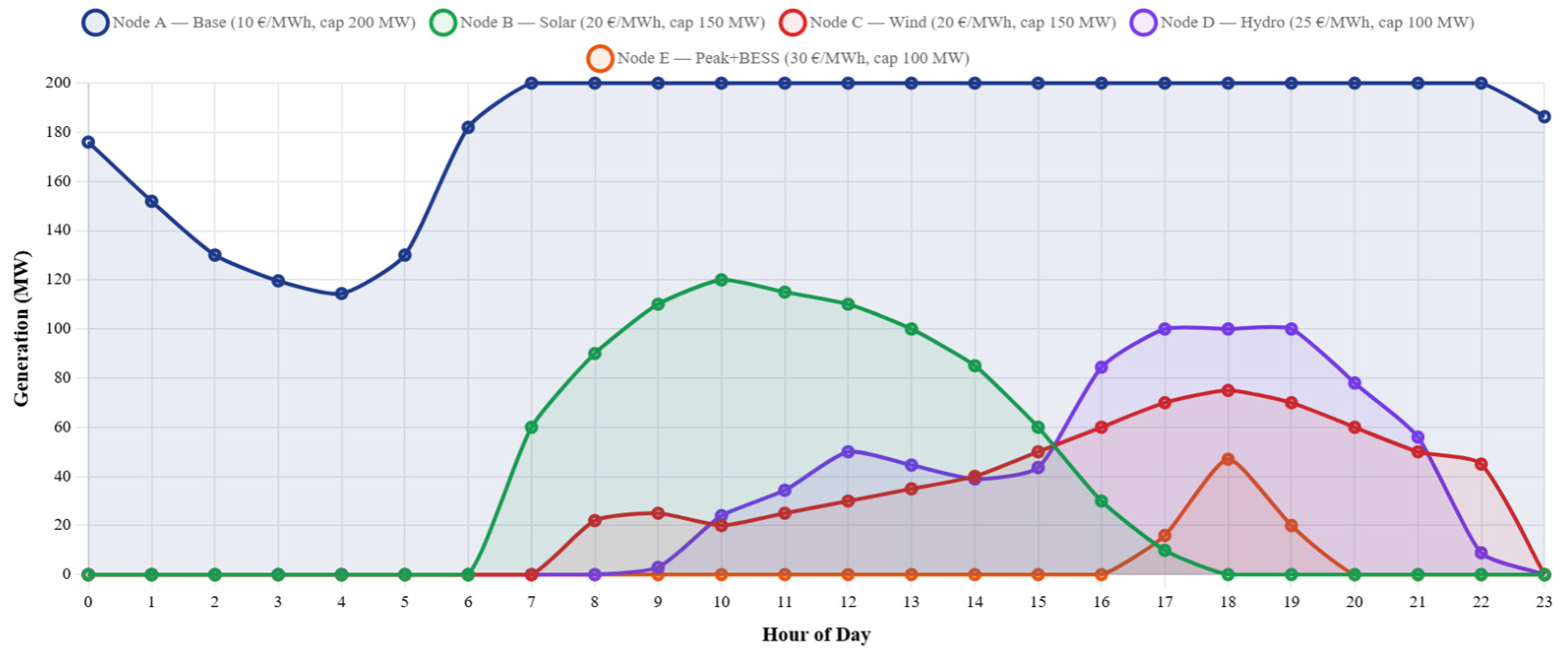 While the model employs a simplified five-node DC framework with deterministic generation and demand profiles, heuristic OPF, rule-based BESS control, and a 24 h horizon, these features offer distinct methodological and practical advantages. The compact network enables transparent observation of symmetry-preserving and symmetry-breaking regimes, isolating causal relationships between congestion, renewable variability, and price asymmetry. Deterministic profiles and rule-based control reduce stochastic noise, creating a controlled environment where the structural effects of congestion and variability can be rigorously quantified. Excluding reactive power and network losses focuses the analysis on essential mechanisms driving nodal price asymmetry and congestion signaling.