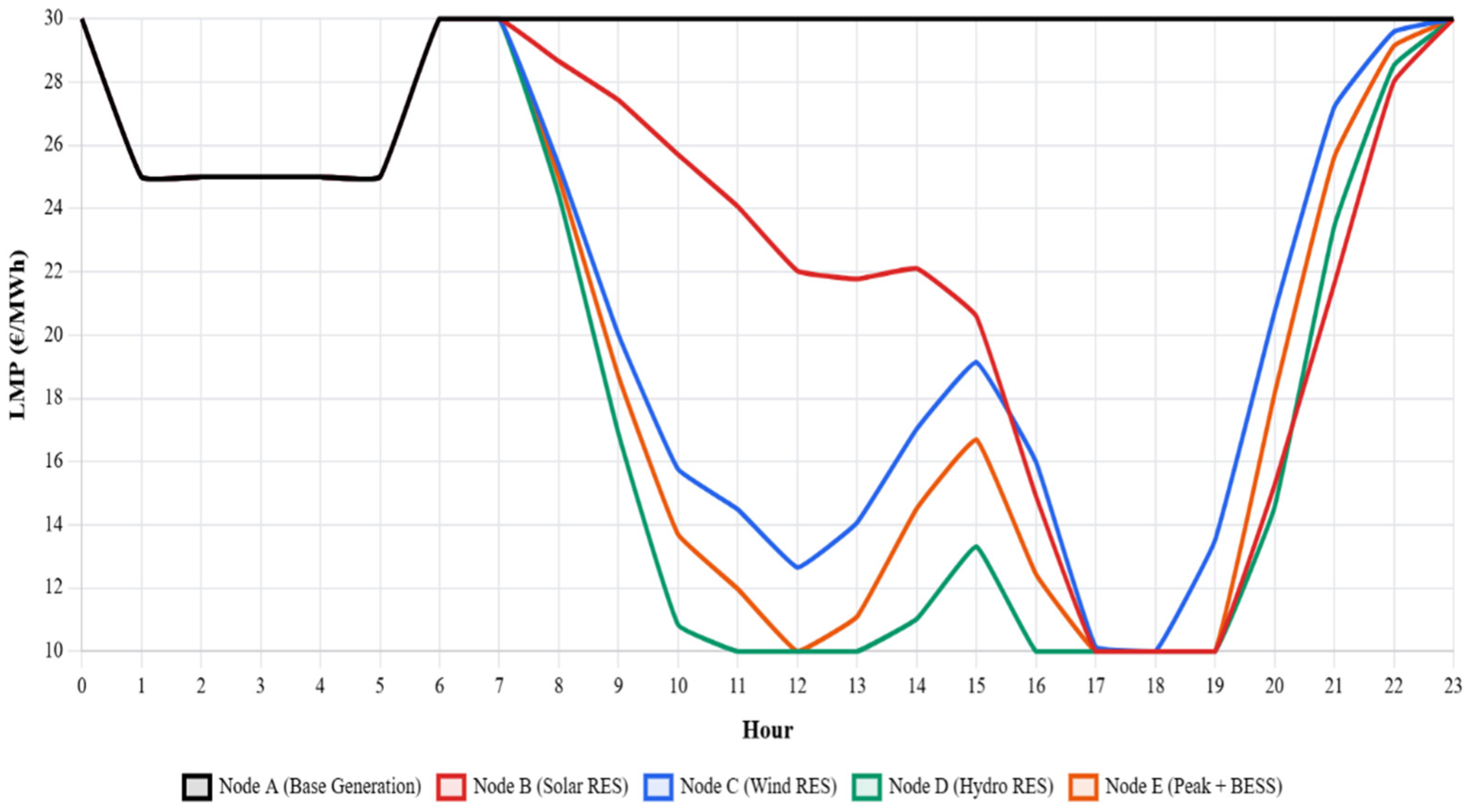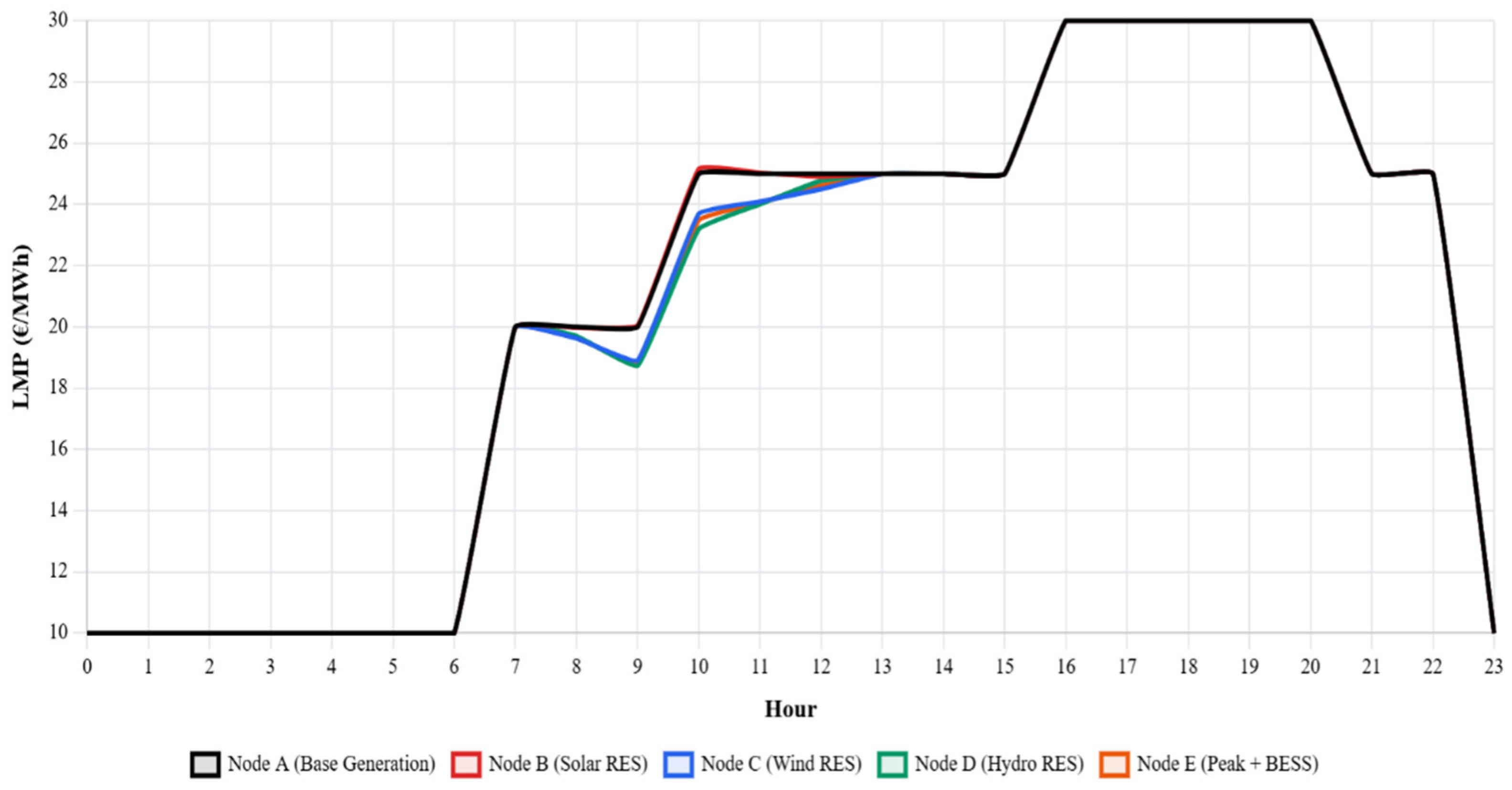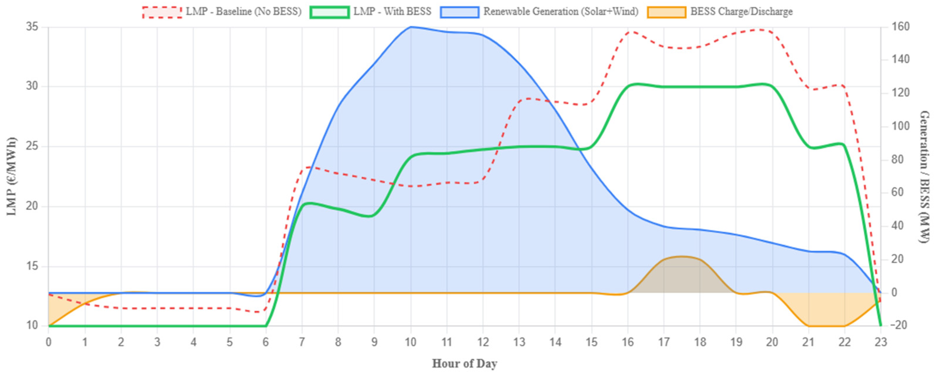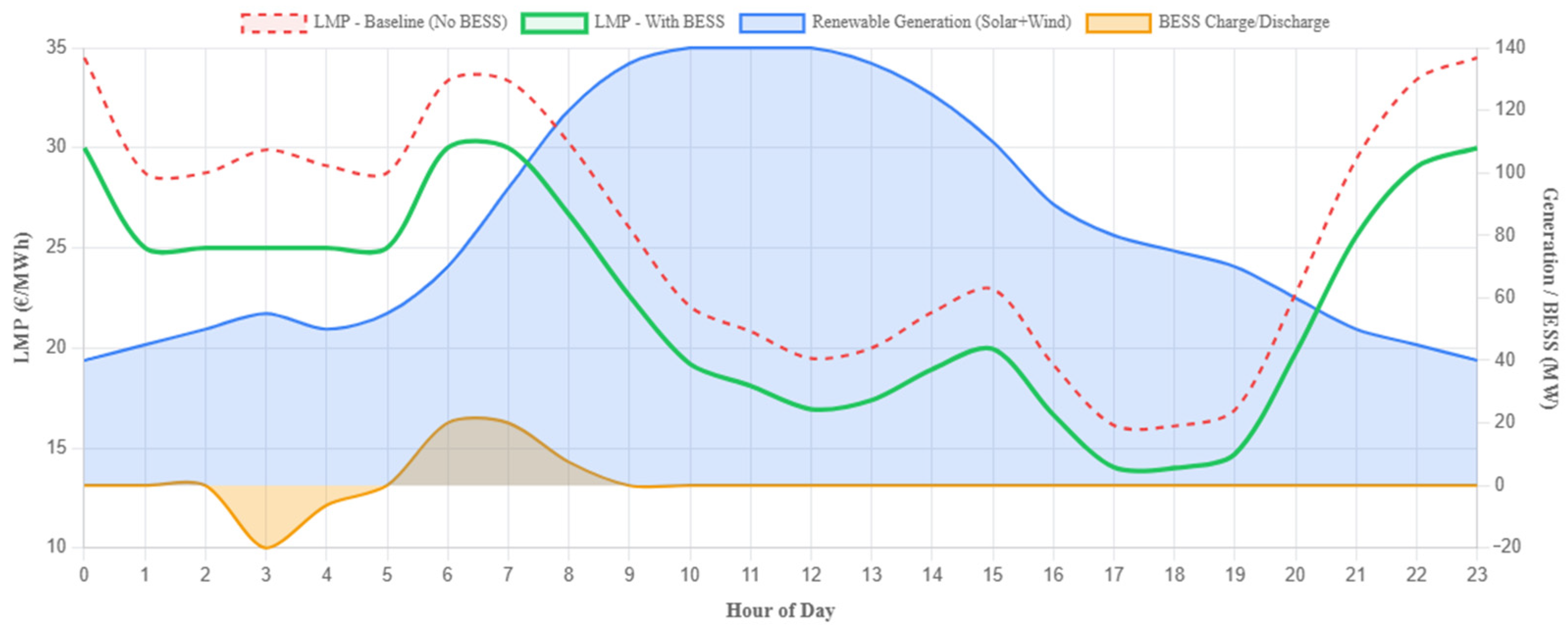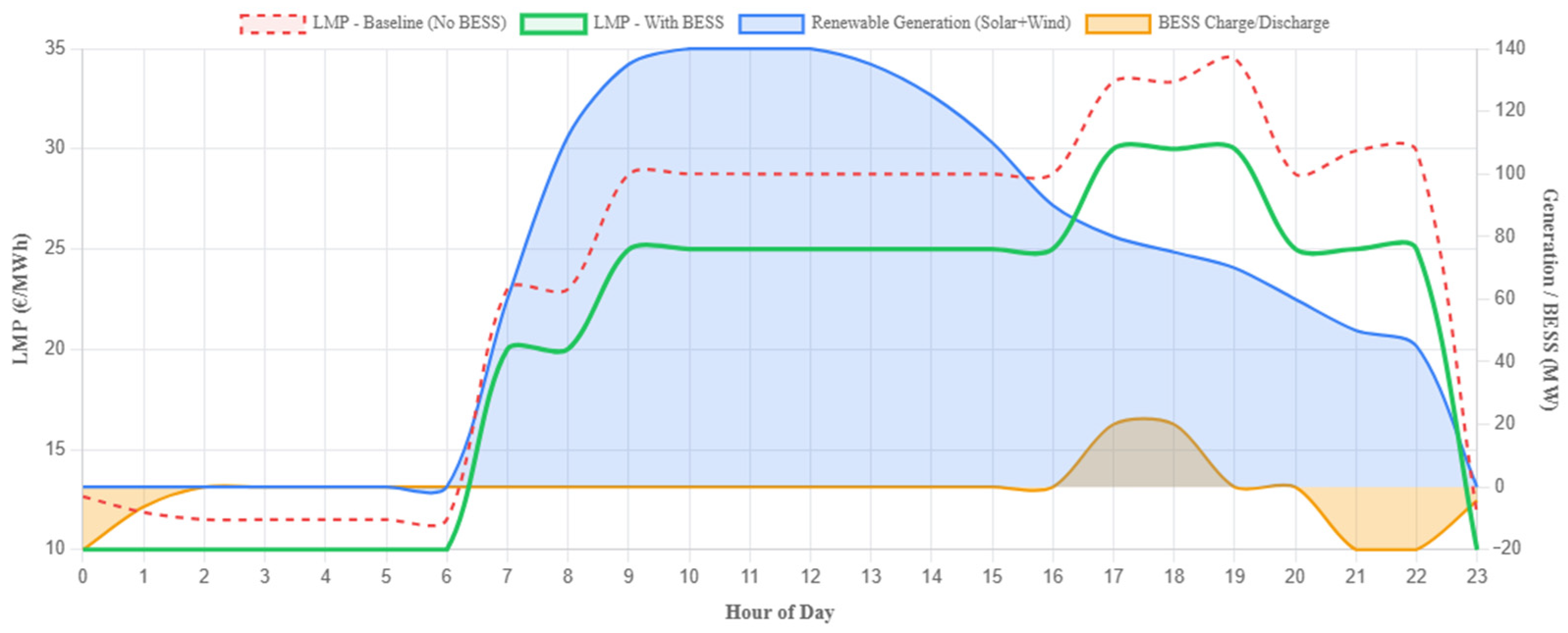An additional effect of BESS operation can be observed during nighttime hours. When system demand is low, the storage unit typically operates in charging mode. This behavior increases the local electricity demand at node E and slightly raises the local LMP relative to the no-storage scenario. However, because transmission congestion is generally absent during these hours, the resulting price increase remains small and does not significantly affect the overall system price level. This observation confirms that the primary price-stabilizing effect of the BESS occurs during peak-demand periods rather than during off-peak hours.