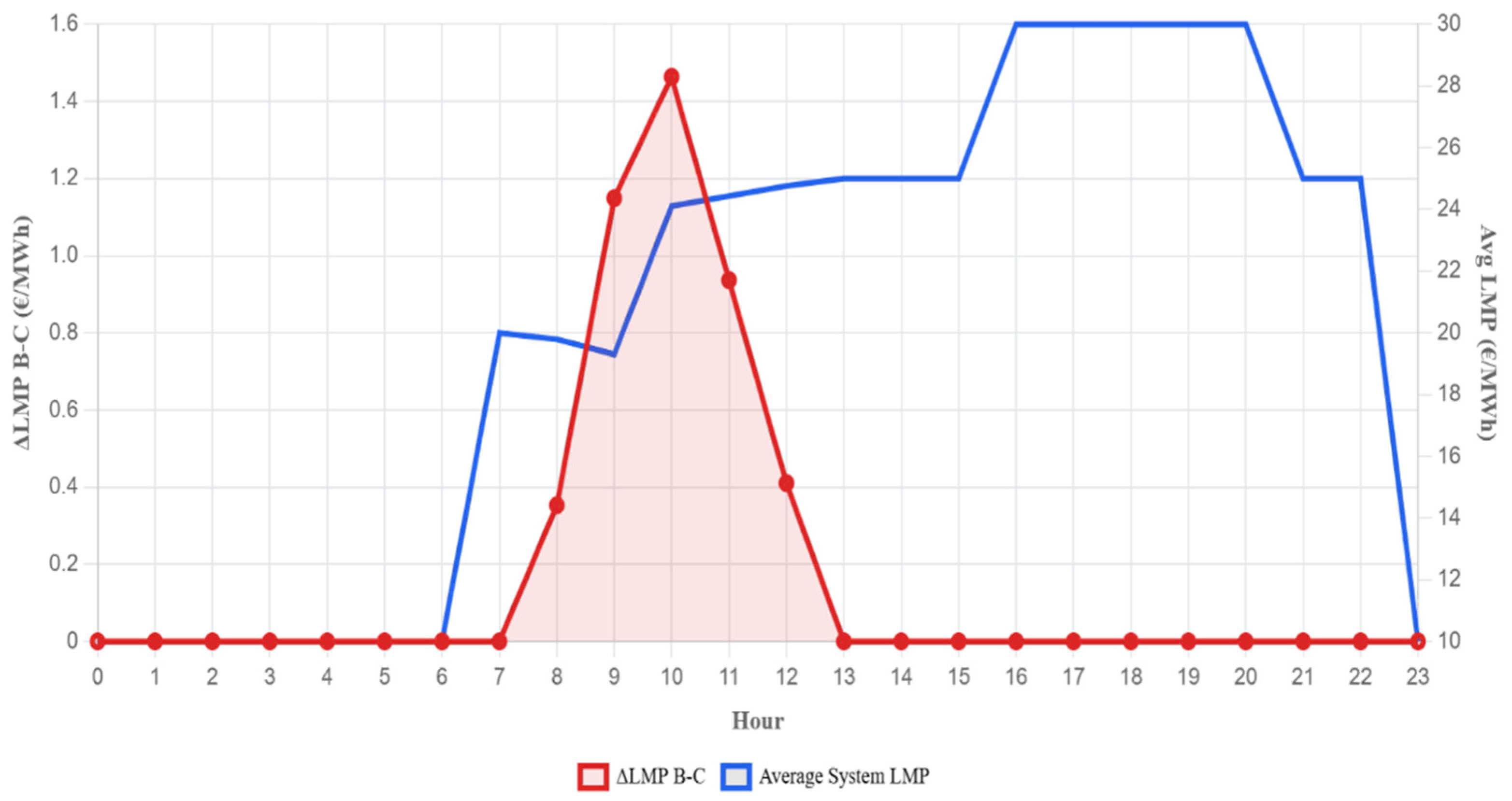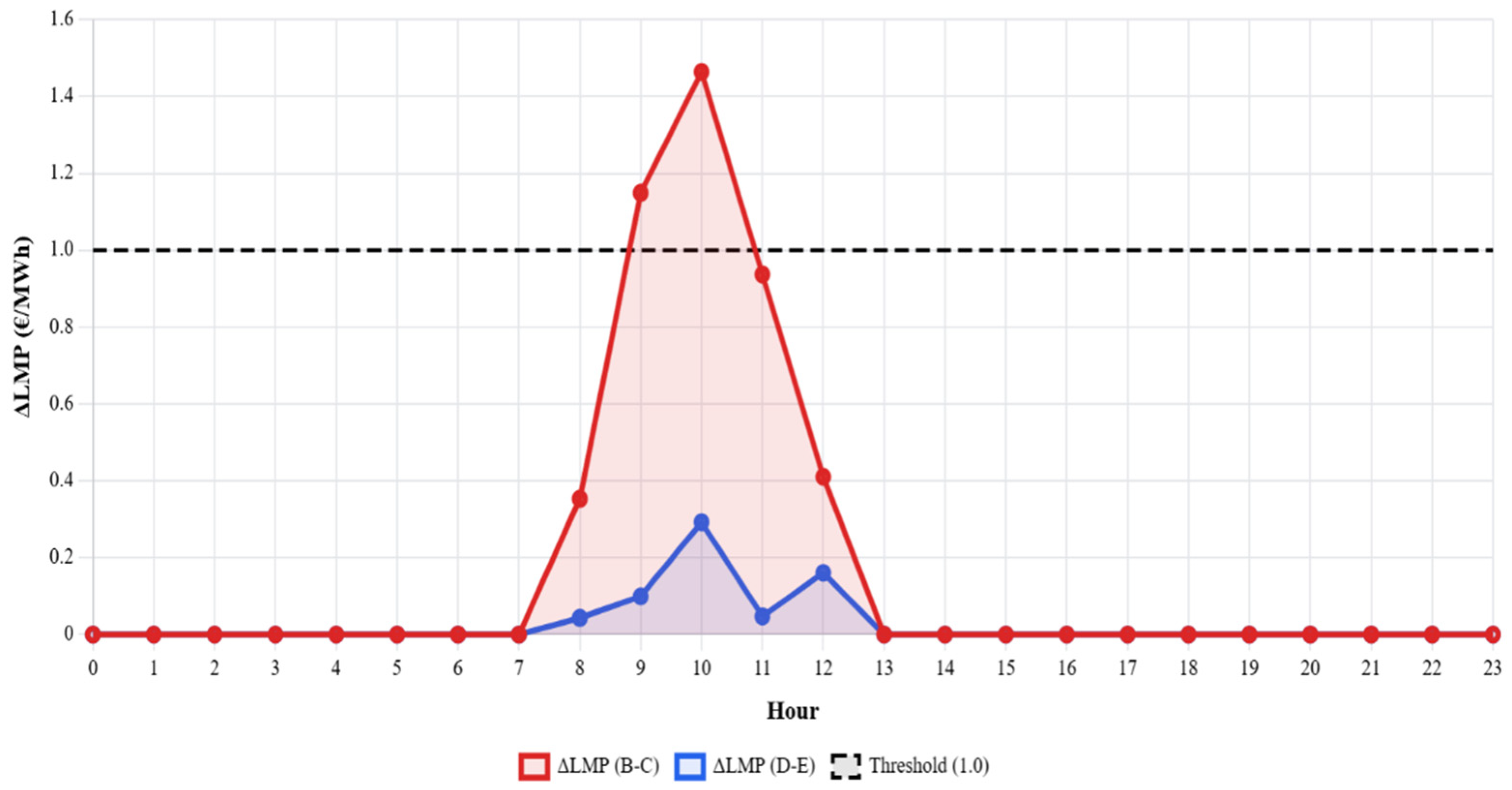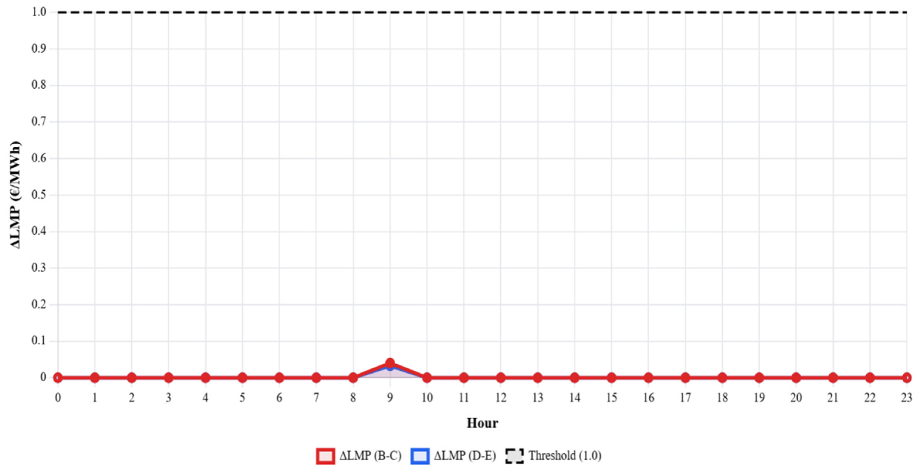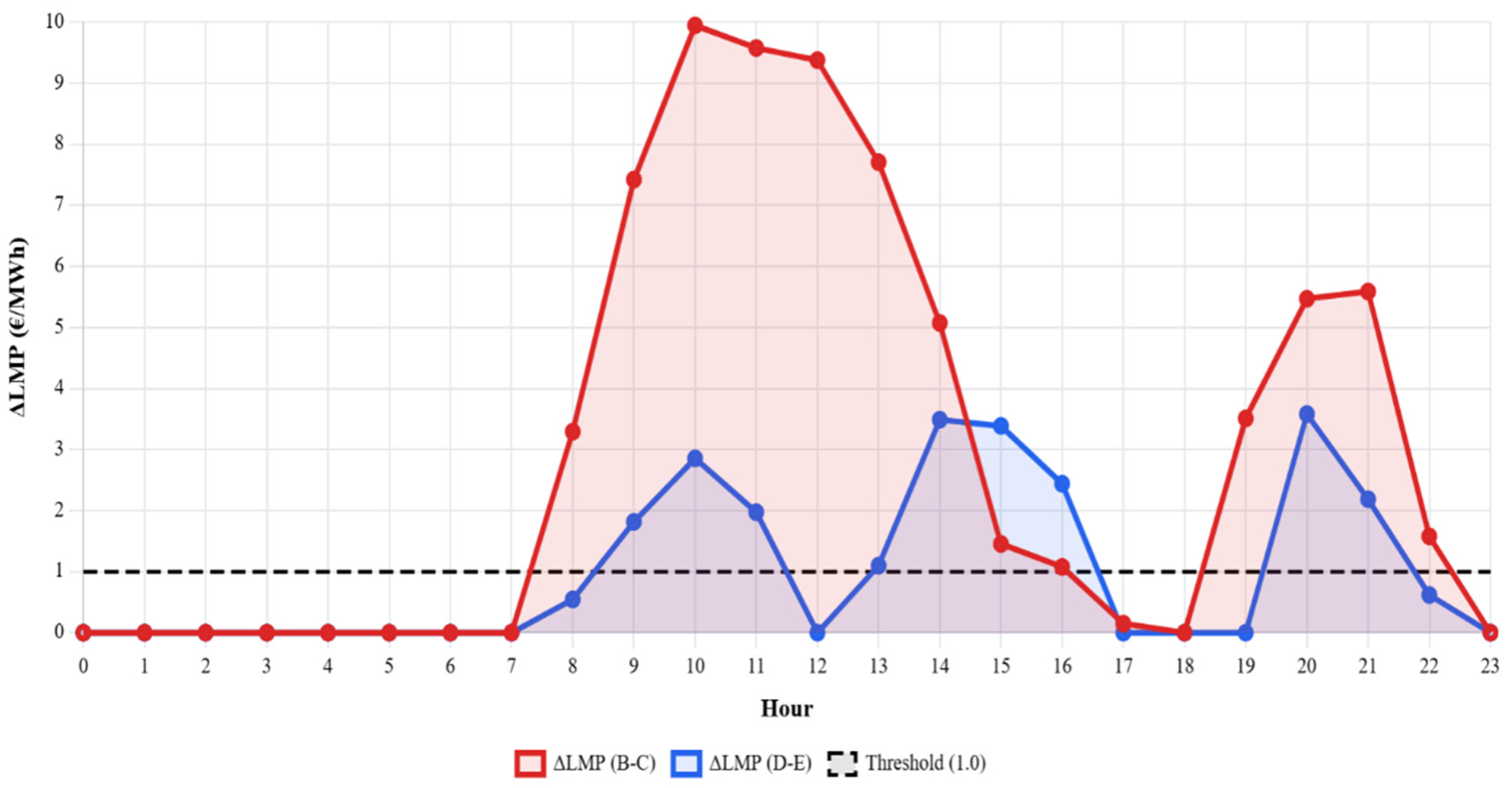 For each capacity level, a full 24 h simulation was performed and the main characteristics of the ΔLMP signal were recorded, including the maximum ΔLMP value and the hour at which the warning threshold of €2/MWh was first exceeded.