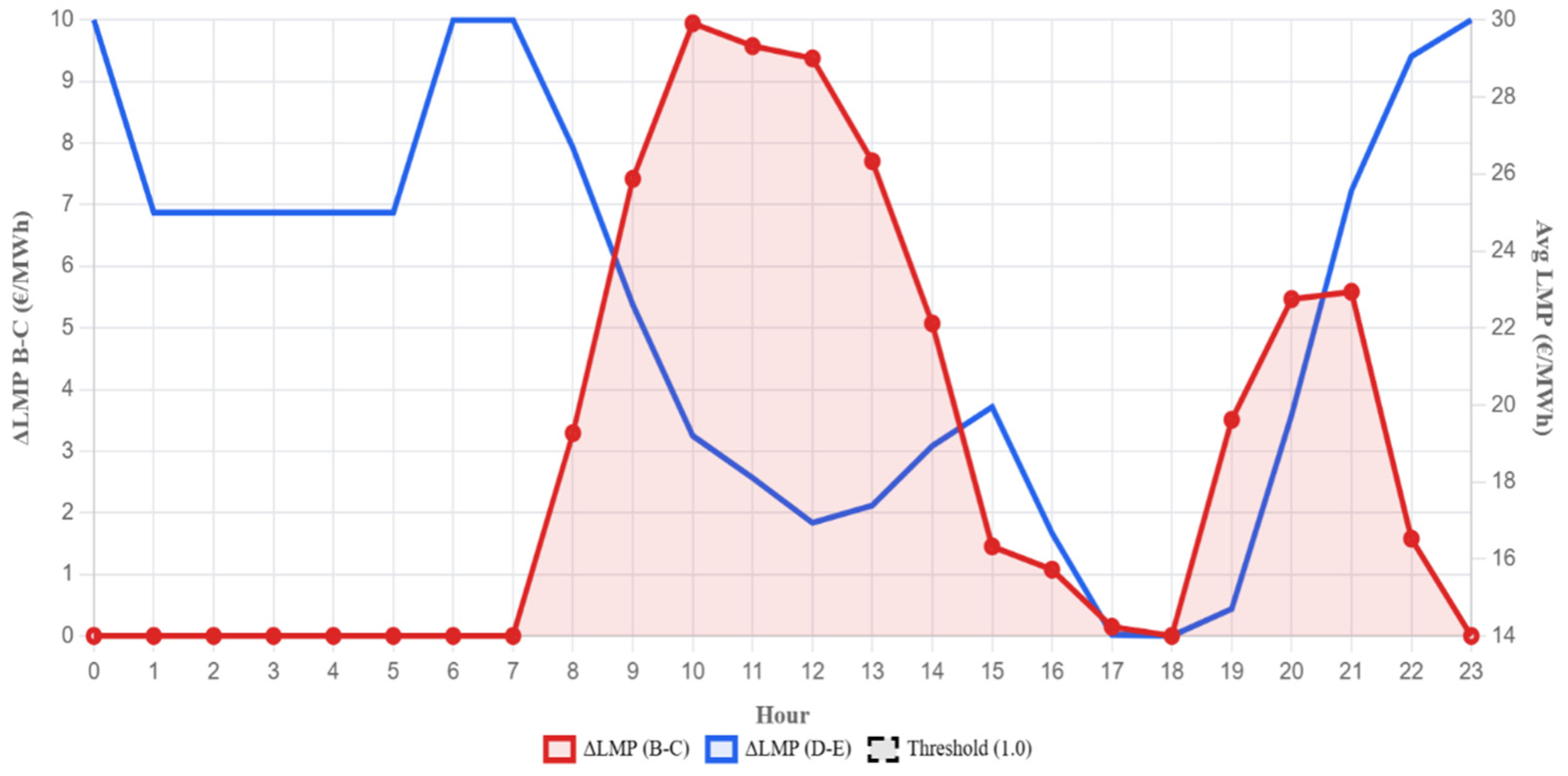 Third, threshold-based diagnostics are effective. Values of ΔLMP exceeding approximately €2/MWh consistently precede critical price events (LMP > €25/MWh), demonstrating that symmetry loss can function as an early-warning metric.