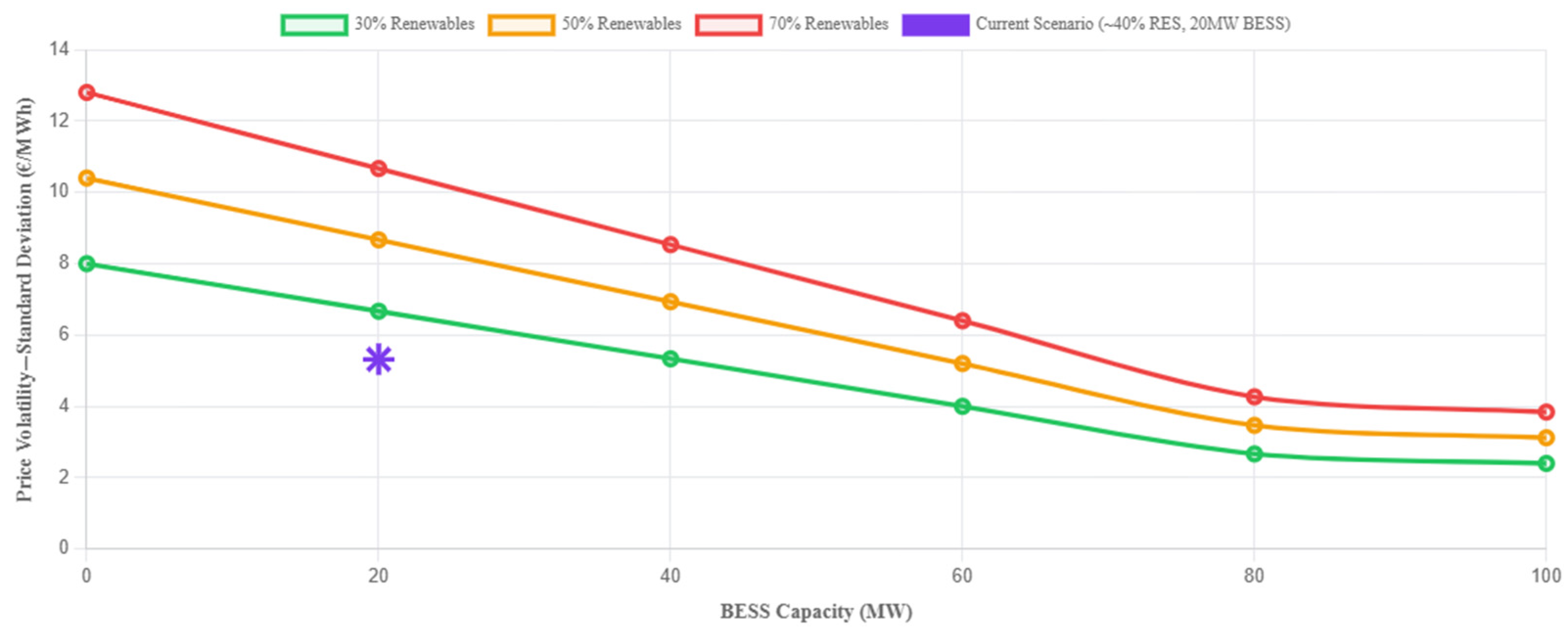 This section investigates the impact of BESS capacity on price volatility through a parametric sensitivity analysis.