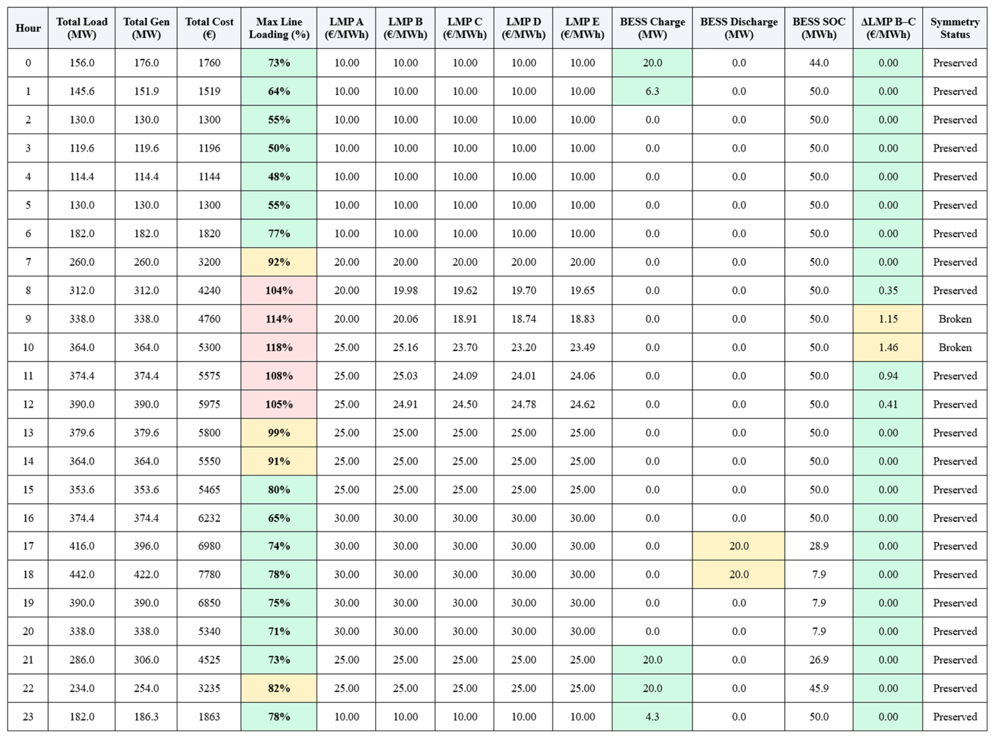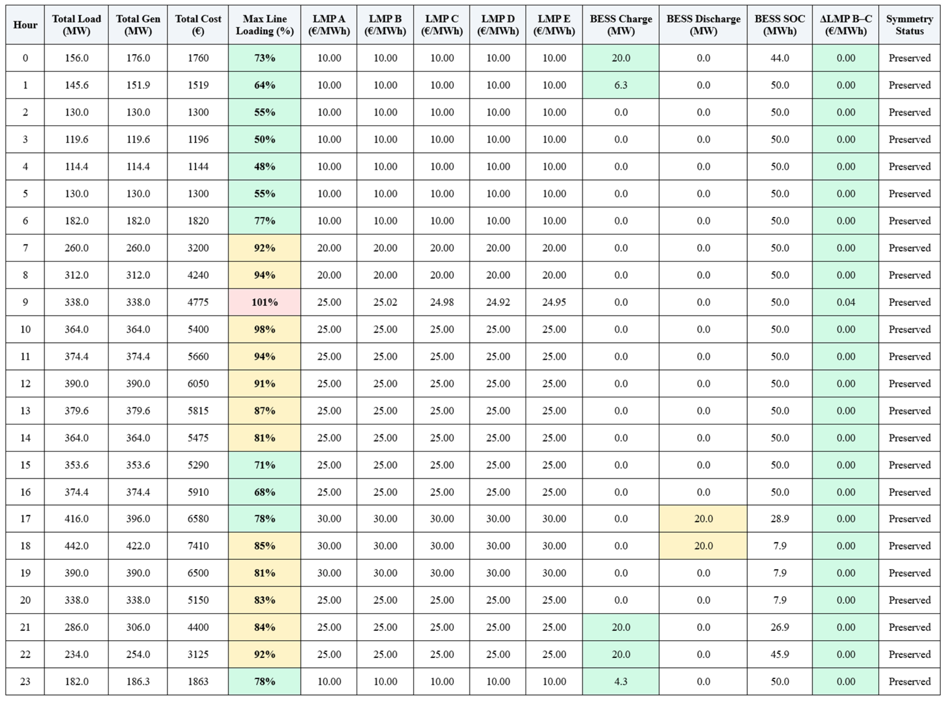 Focusing on active power flows without modeling reactive power or network losses simplifies interpretation of symmetry-breaking mechanisms. While this limits absolute precision, it emphasizes the causal relationship between transmission constraints and price formation, facilitating identification of congestion zones and the role of flexible resources. Likewise, the 24 h temporal horizon concentrates attention on intra-day dynamics, enabling detailed insight into hourly LMP evolution, ΔLMP excursions, and BESS response, while providing a transparent foundation for future multi-day or seasonal studies.