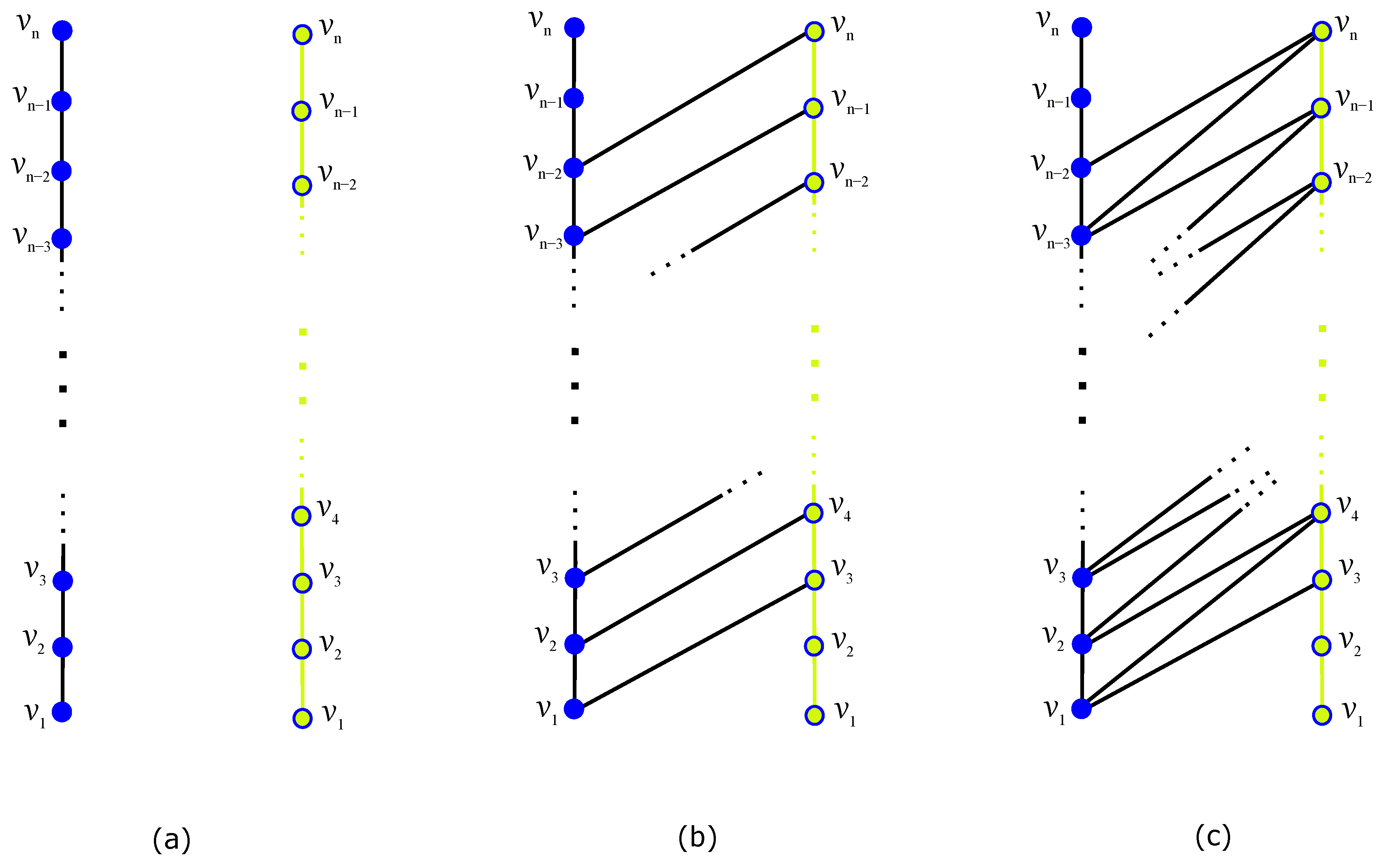 Figure 1. Three planar drawings of  P n k  on a cylinder for  k = 1 , 2 , 3 : (a) the planar drawing of  P n 1 , (b) the planar drawing of  P n 2 , (c) the planar drawing of  P n 3 .