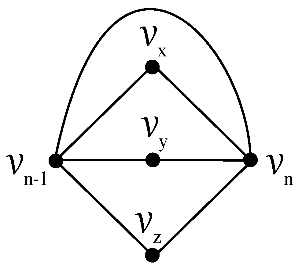 We can refer to the drawing in Figure 2 in the case of a planar drawing of  G . The edge  v x v z  must cross some edge of  G , and every triple of edges  v n 5 v x , v n 5 v y , v n 5 v z  and  v n 6 v x v n 6 v y v n 6 v z  must also produce at least one crossing on some edge of  G . Assuming  cr D ( v n ) = 1 , there is only one crossing on four edges  v x v n v y v n v z v n v n 1 v n  in D. Finally, again by removing three edges  v x v n 1 v y v n 1 v z v n 1  and subsequently by smoothing the vertex  v n 1  (similarly as in the proof of Lemma 1), we obtain a drawing of the graph isomorphic to  P n 1 4  with at most  n 6  crossings. The proof is done due to the obtained contradiction to Theorem 2. □