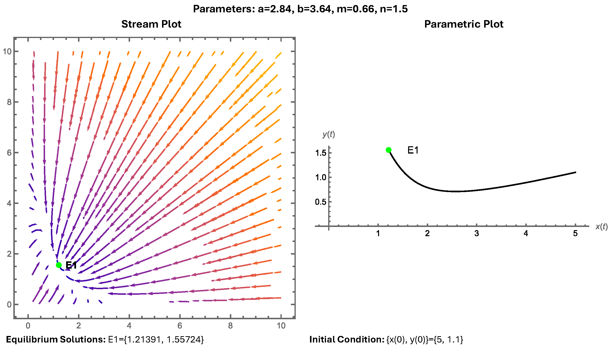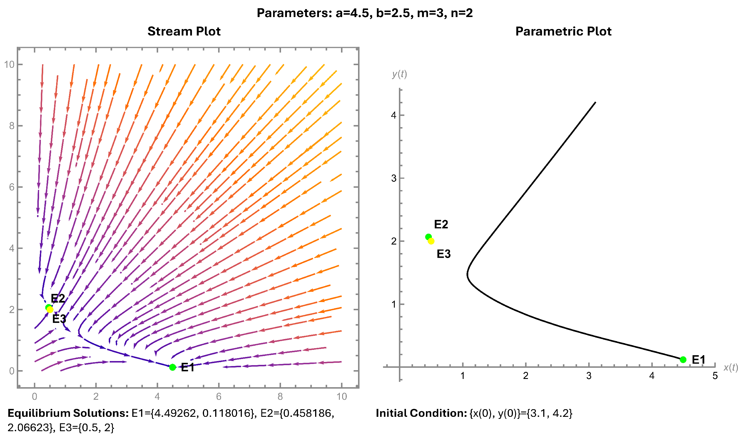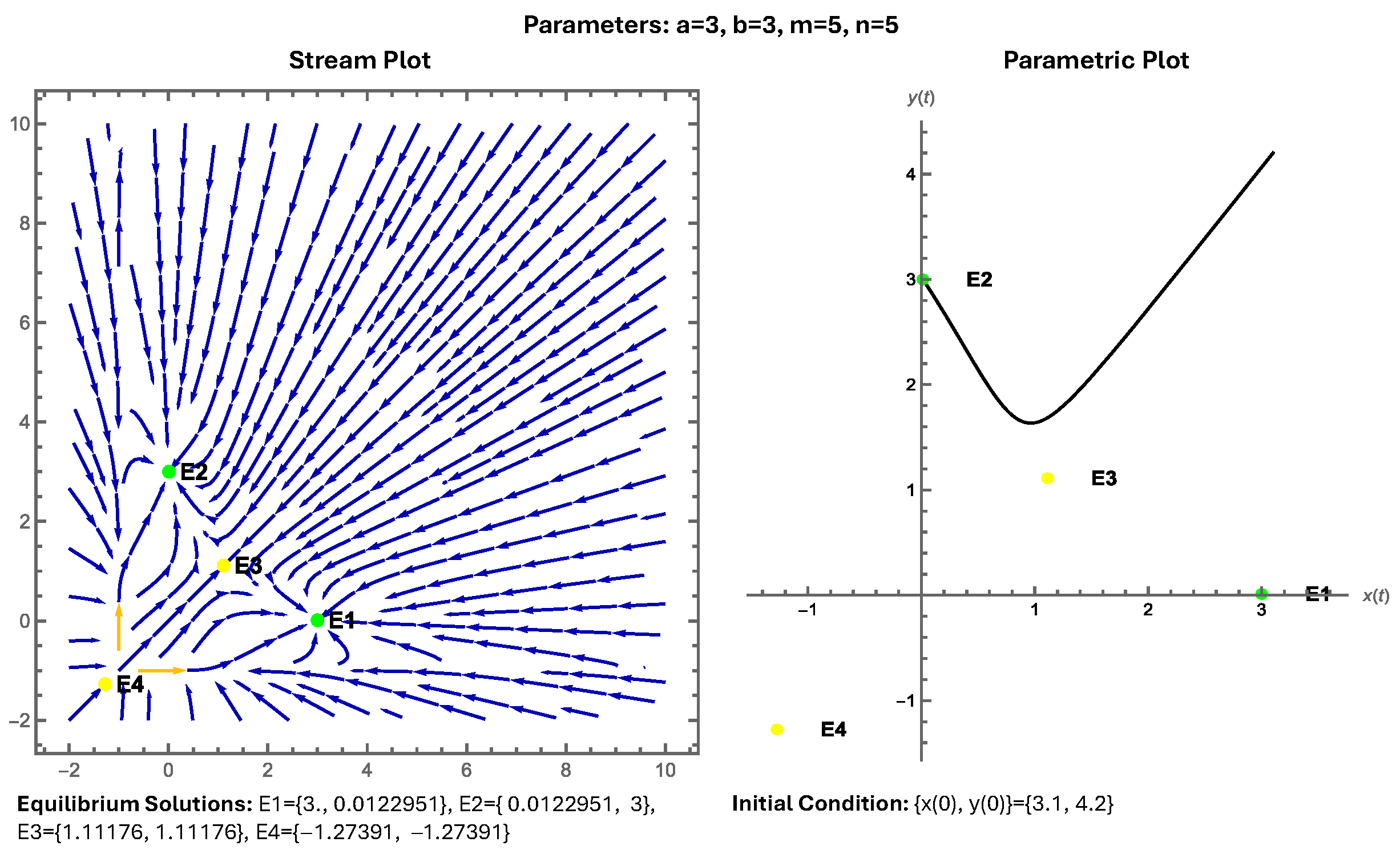 Remark 8. In view of the symmetric nature of system (13), all Figure 7, Figure 8, Figure 9, Figure 10, Figure 11 and Figure 12 are perfectly symmetric for the symmetric choice of parameters. Figure 6 and Figure 13, Figure 14 and Figure 15 are asymmetric due to the asymmetric choice of parameters. Similar results for cooperative systems have been proved in [23]; however, their biological implications are different since, in the cooperative case, 0 is a locally asymptotically stable equilibrium which implies the presence of Allee’s effect. Theorem 3. - (a)