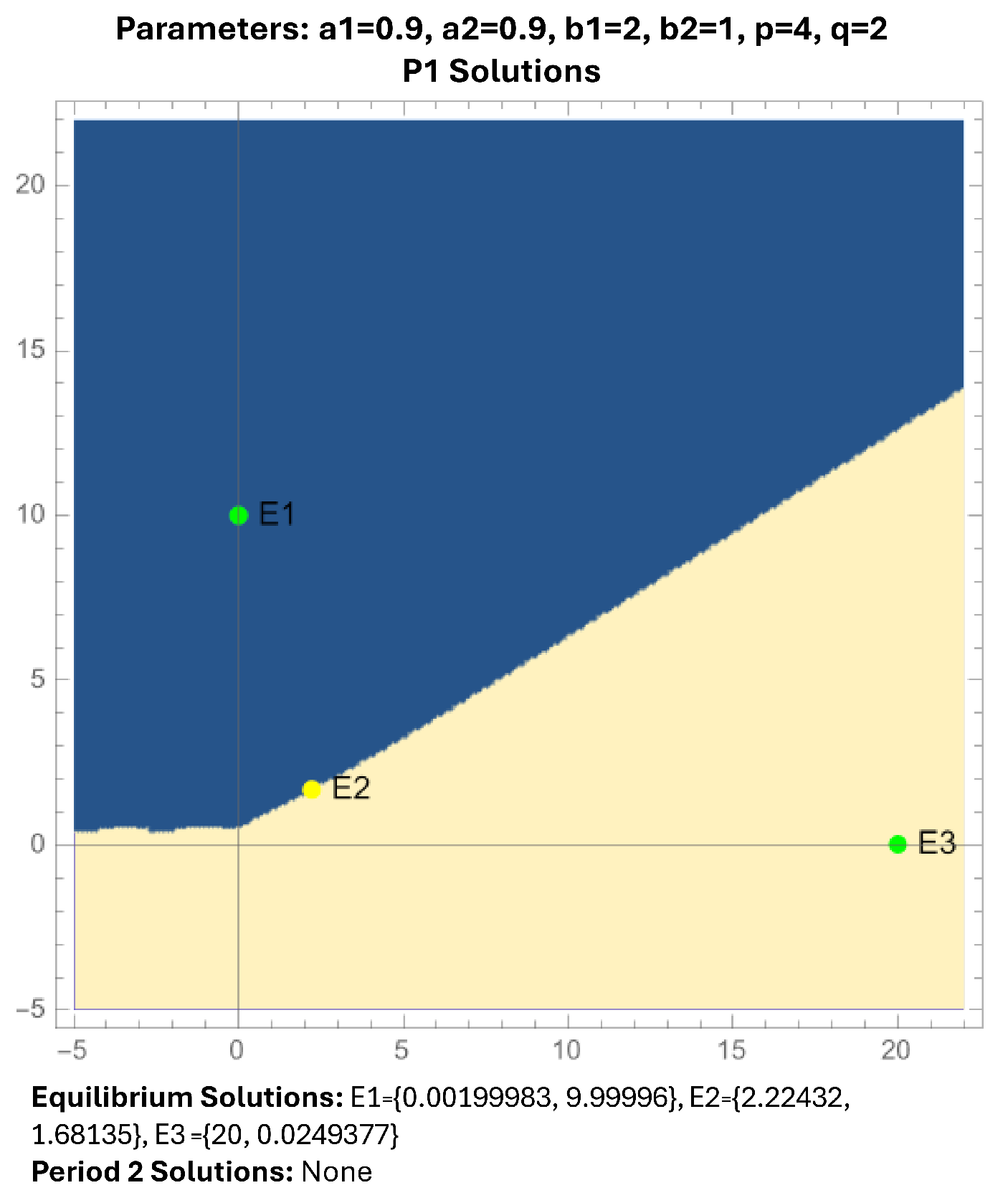 This figure illustrates Theorem 3. There are two locally stable fixed points on the axis and one saddle point on the bisector in the first quadrant with corresponding basins of attractions, which represent the biologically feasible solutions. There are also three feasible period-two solutions. All solutions are given with the corresponding basins of attractions. For P1 Solutions: The brown region is the basin of attraction of and the tan region is the basin of attraction of . For P2 Solutions: The dark blue region is the basin of attraction of , the light blue region is the basin of attraction of , the orange region is the basin of attraction to , and the tan region is the basin of attraction to .
