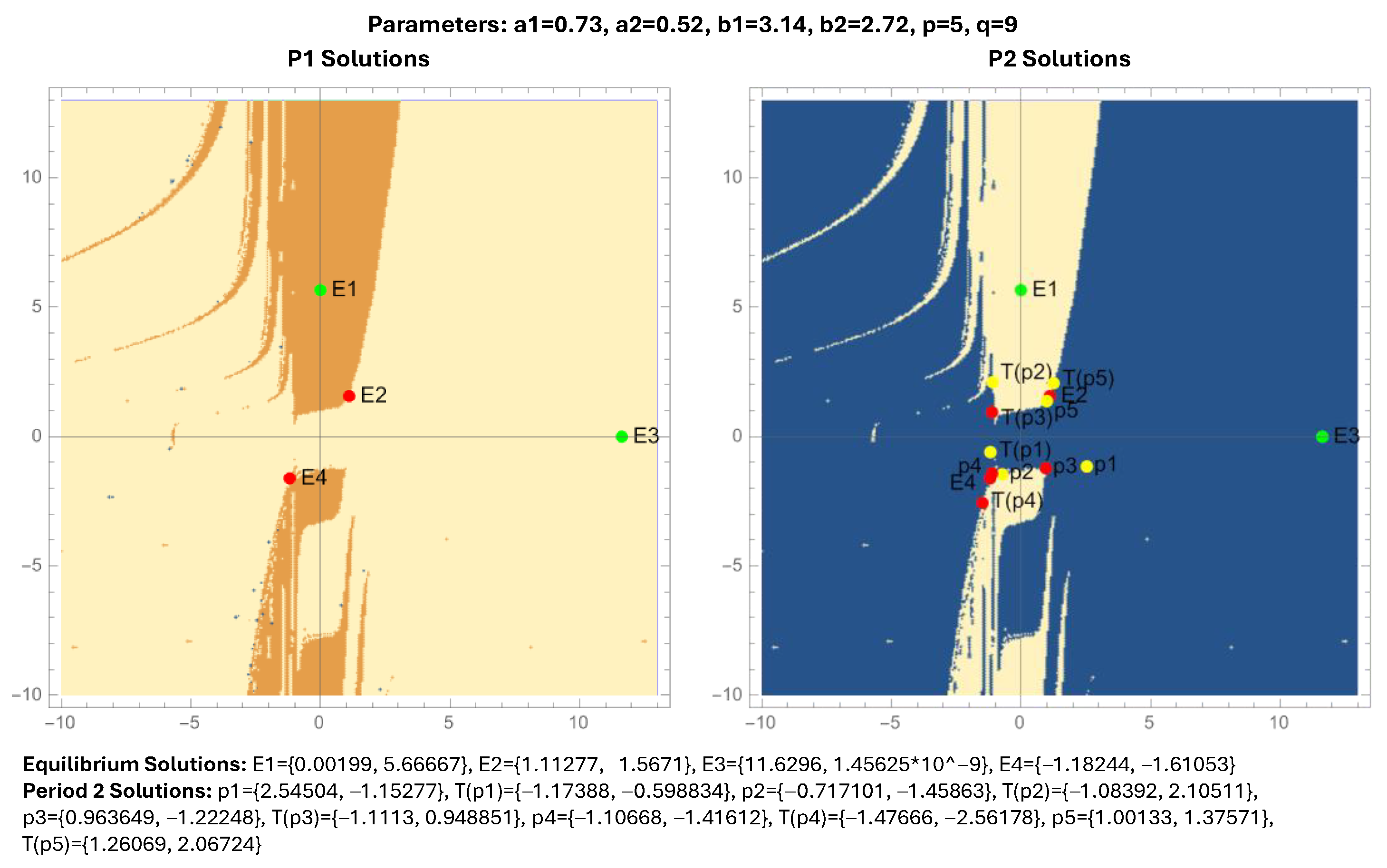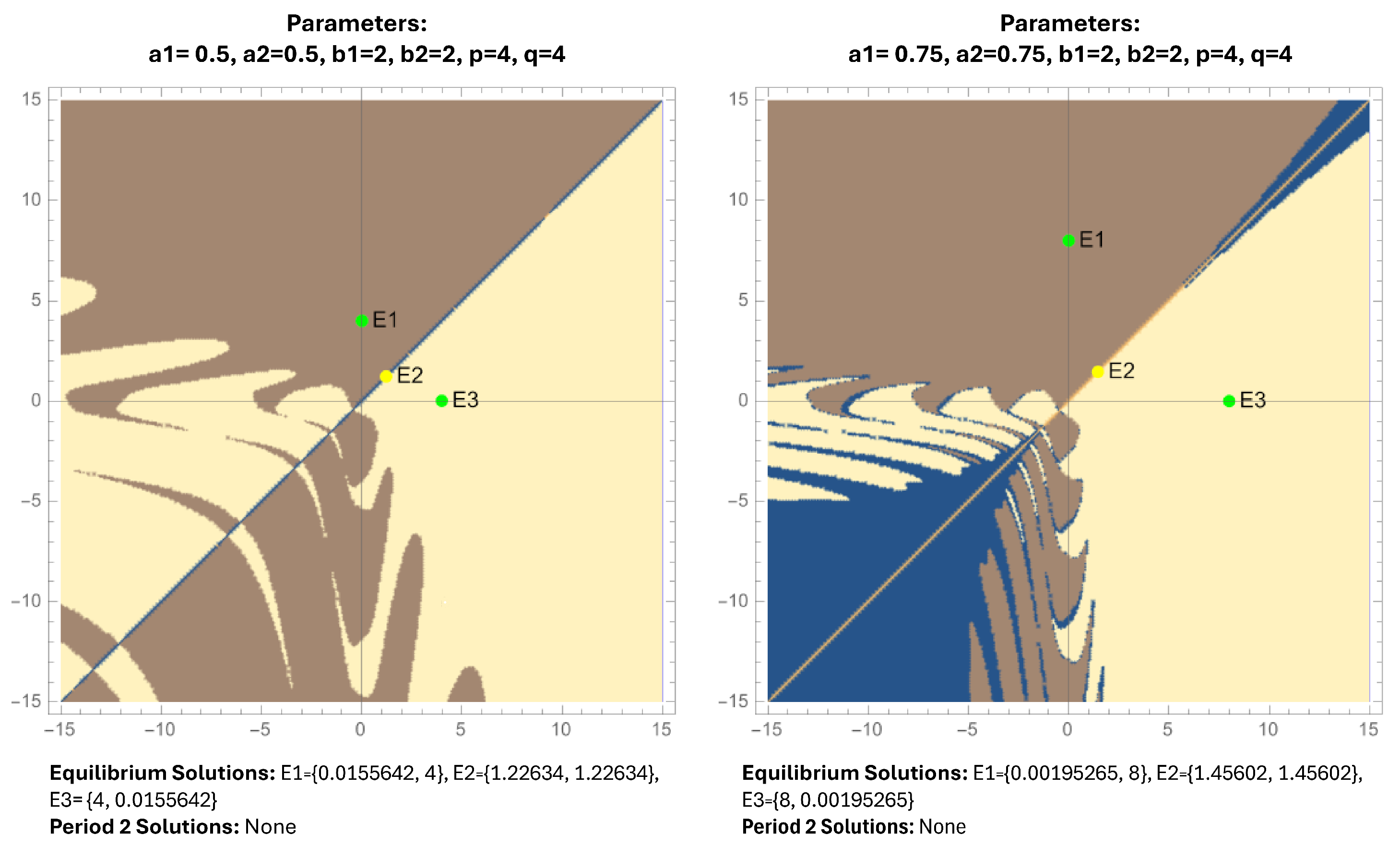 13]. The blue region of the picture on the left is an immediate basin of attraction of locally stable period-two solution. For P1 Solutions: The brown region is the basin of attraction of