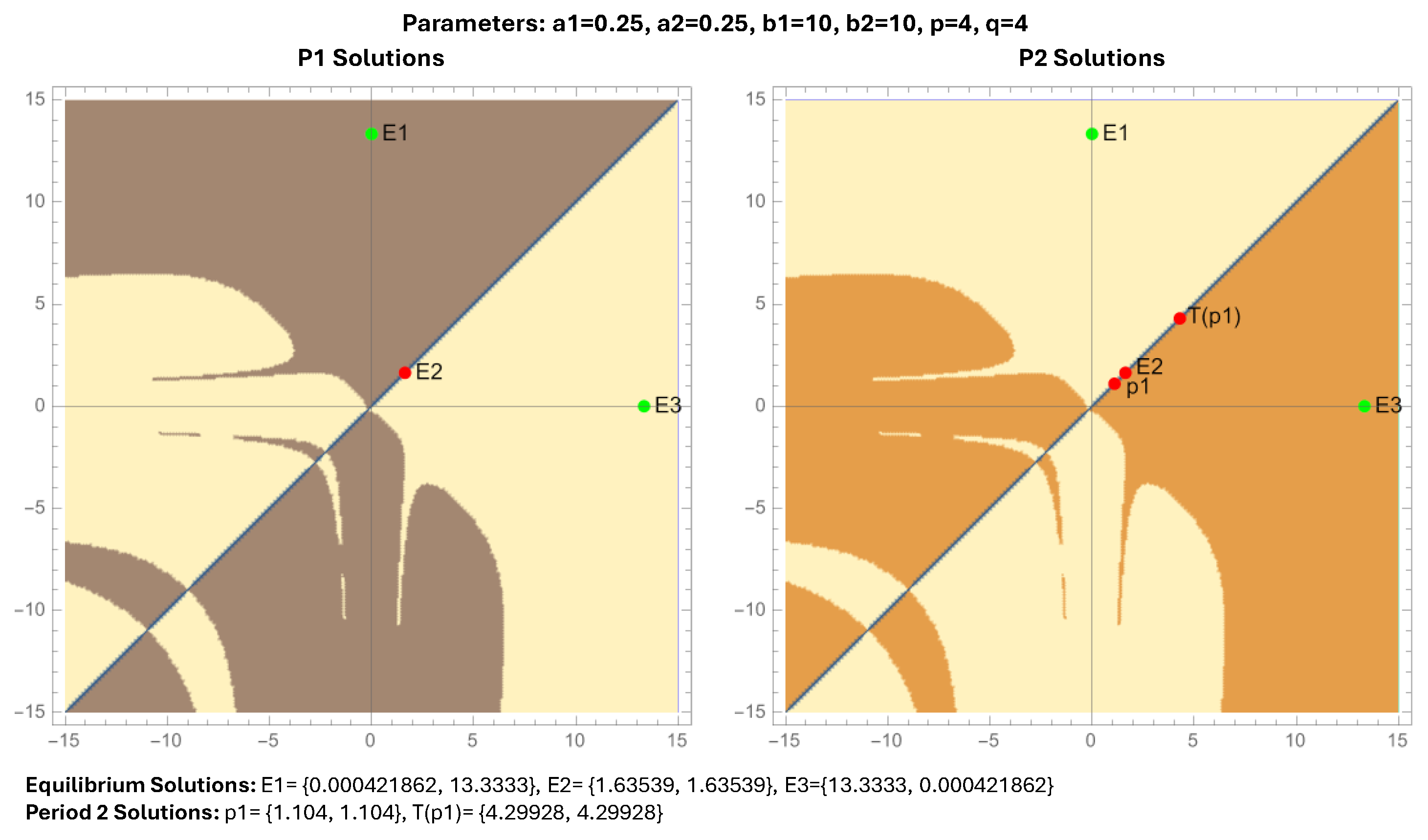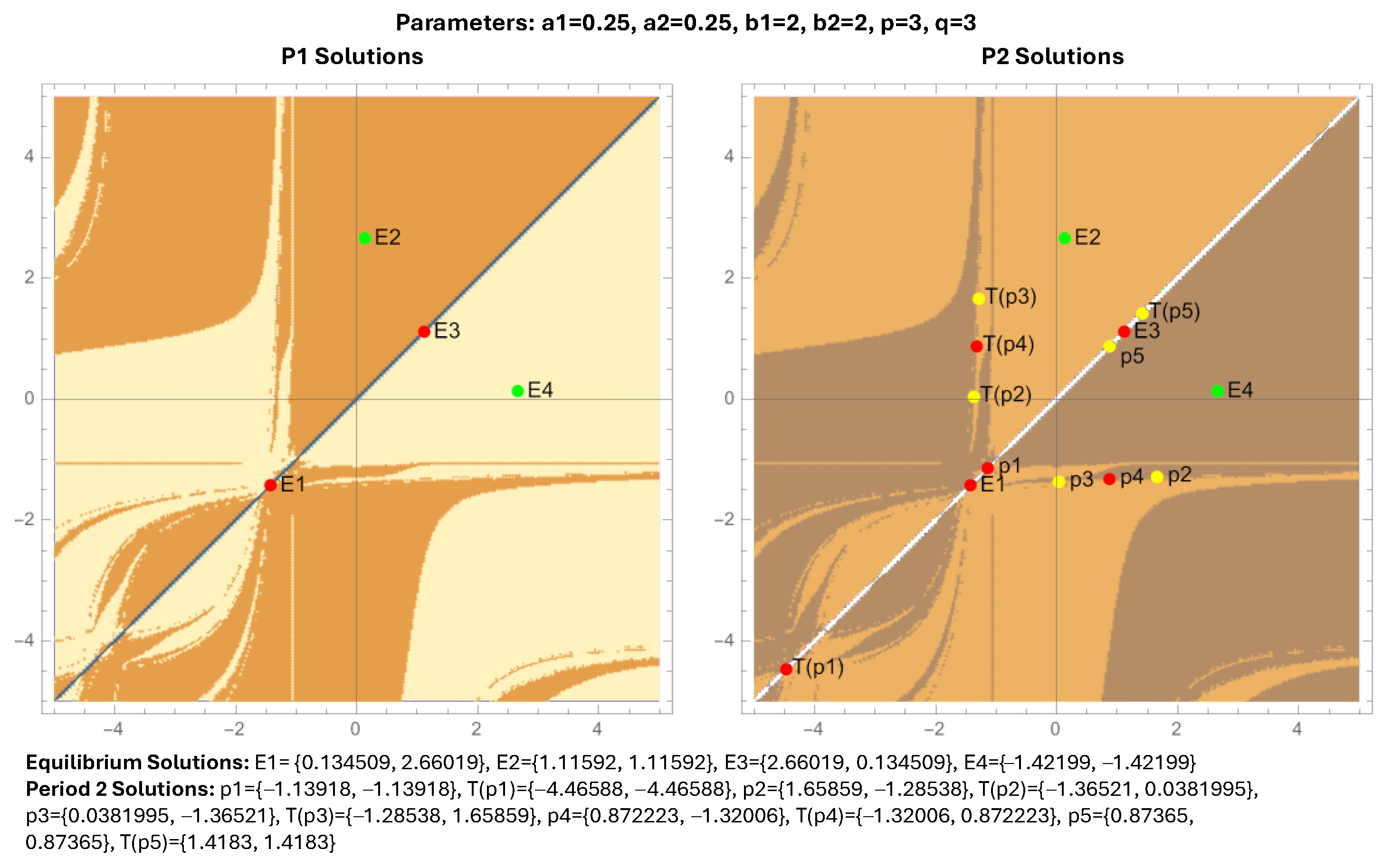 This figure illustrates Theorem 3. There are three equilibrium points on the left figure and a single period-two solution on the bisector. The full basin of attractions of two equilibrium points are visualized as preimages of the immediate basins of attractions. For P1 Solutions: The brown region is the basin of attraction of and the tan region is the basin of attraction of . For P2 Solutions: The tan region is the basin of attraction of and the orange region is the basin of attraction of .