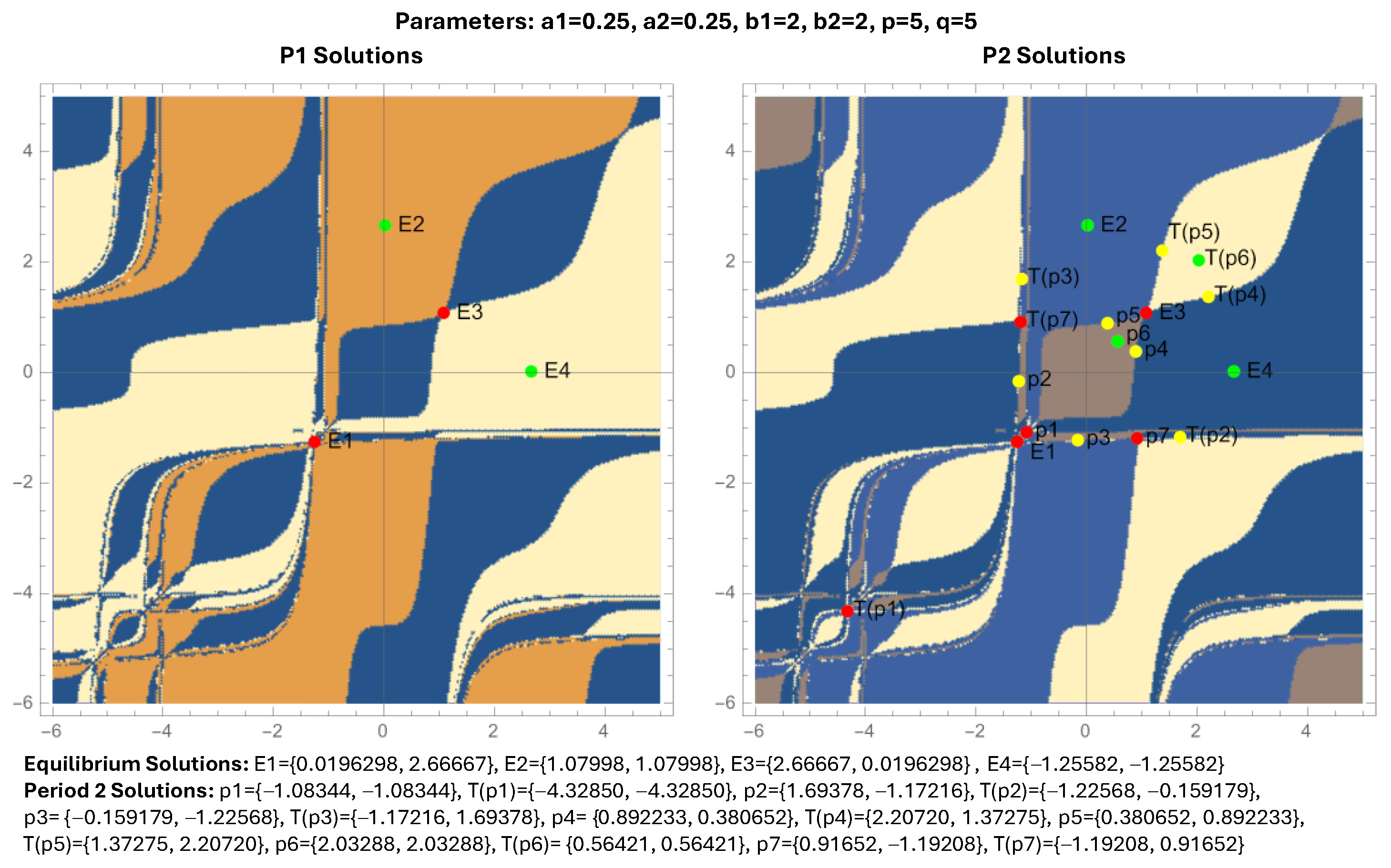 This figure illustrates both Theorems 2 and 3. There are two locally stable fixed points on the axis and one saddle point on the bisector in the first quadrant with corresponding basins of attractions, which represent the biologically feasible solutions. There is also one non-feasible equilibrium solution in the third quadrant and five non-feasible period-two solutions. All solutions are given with the corresponding basins of attractions. For P1 Solutions: The oragne region is the basin of attraction of and the tan region is the basin of attraction of . For P2 Solutions: The light blue region is the basin of attraction of , the dark blue region is the basin of attraction of , the brown region is the basin of attraction of , and the tan region is the basin of attraction for .