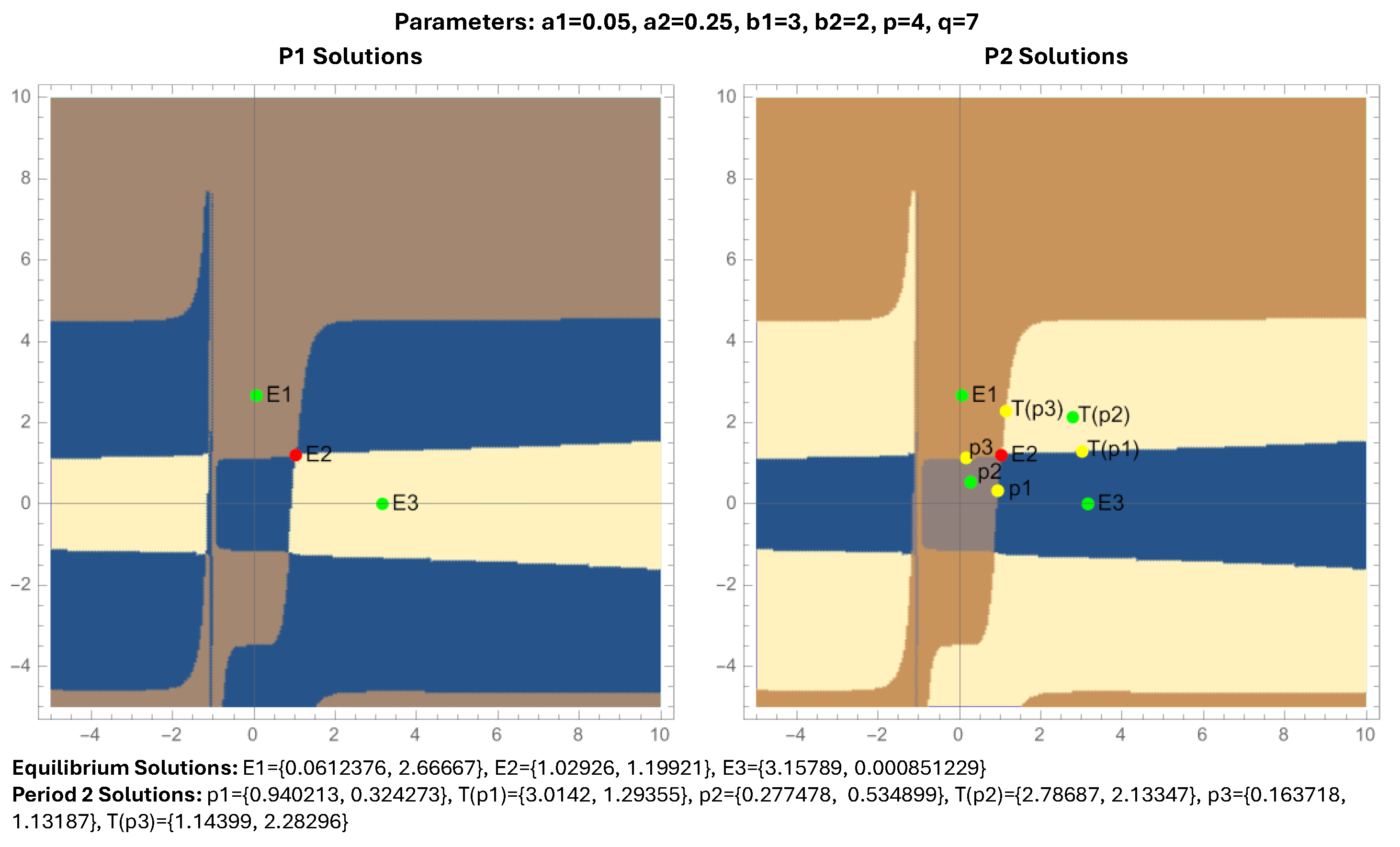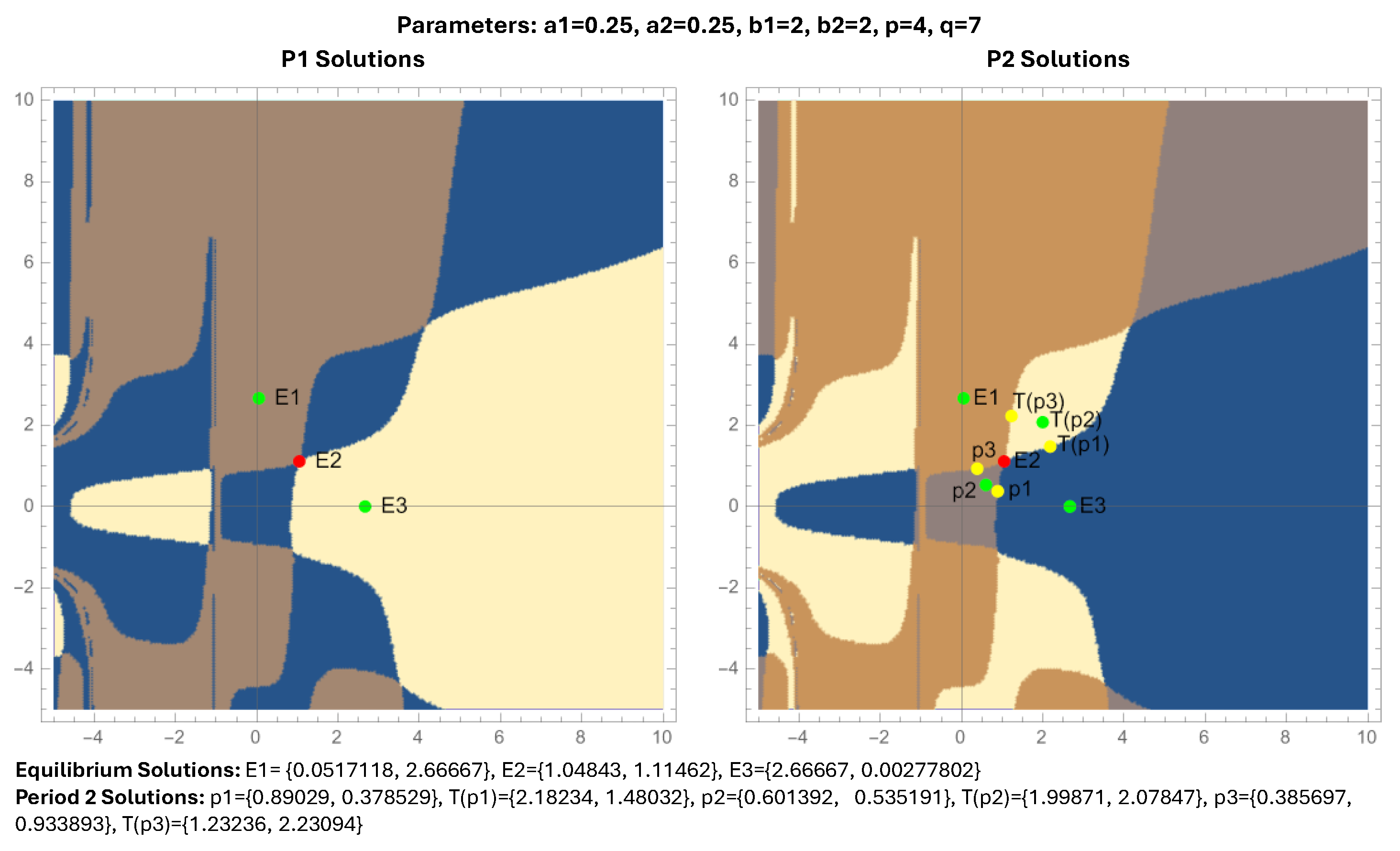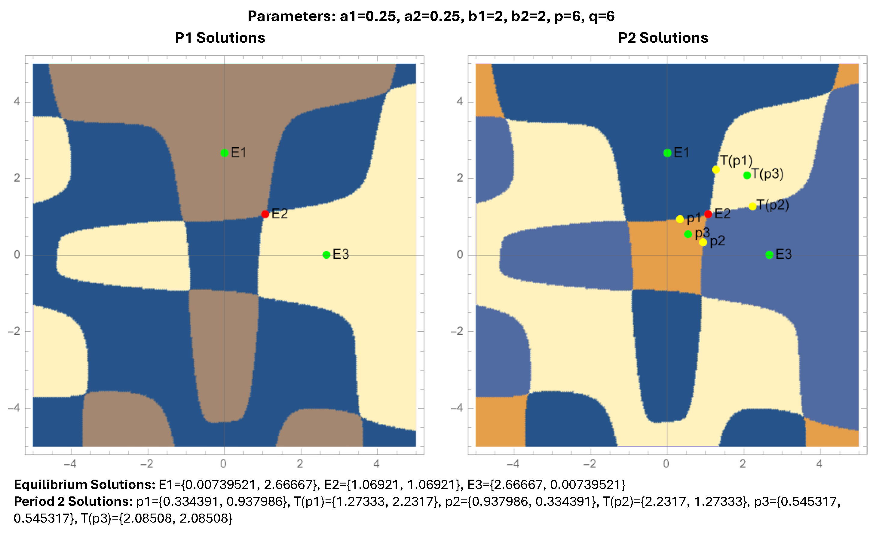 This figure illustrates Theorem 3. There are three equilibrium points in the left figure and two period-two solutions in the right figure. The full basins of attractions of the equilibrium points are visualized as preimages of the immediate basins of attractions. For P1 Solutions: The brown region is the basin of attraction of and the tan region is the basin of attraction of . For P2 Solutions: The orange region is the basin of attraction of , the brown region is the basin of attraction of , and the white region is the basin of attraction for .