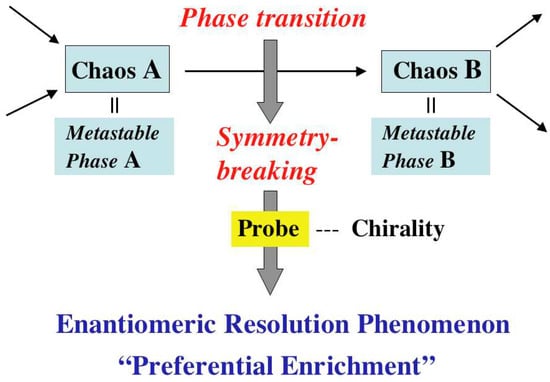Nowadays, a concept of nonlinear “complexity” theory has been recognized to govern various dynamic behaviors in both natural and social sciences. In the complexity system, symmetry is easily broken by the phase transition between two chaotic or metastable states [,,]. Therefore, it might be possible to observe the symmetry-breaking as a chemical complexity phenomenon by using appropriate probes such as chirality (Figure 1).