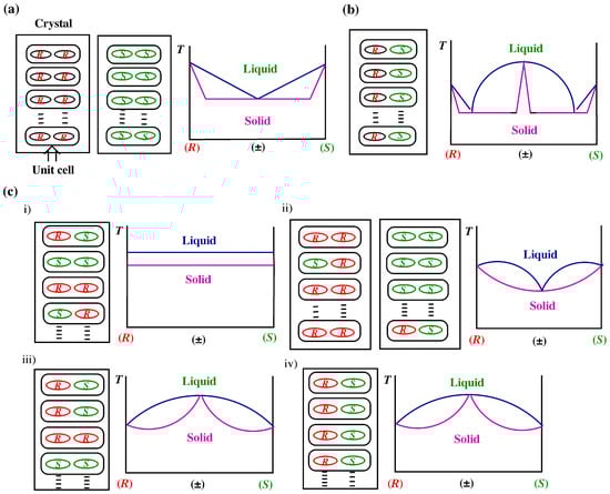 General packing modes and binary melting-point phase diagrams of two enantiomers in (a) a racemic conglomerate, (b) a racemic compound, and (c) a racemic mixed crystal. The racemic mixed crystal is further classified into i) disordered type, ii) fairly ordered one (a racemic conglomerate type), iii) fairly ordered one (a racemic compound type), or iv) highly ordered one.