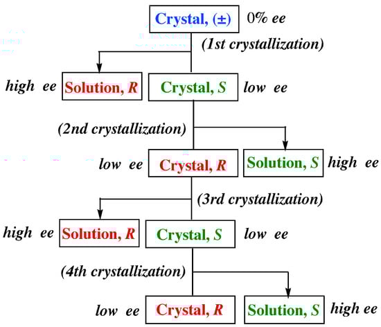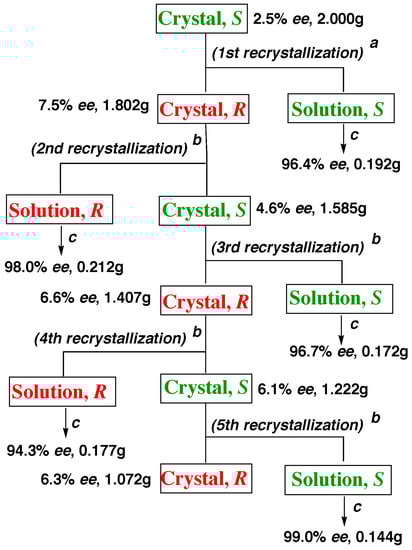 In this context, crystallization of the racemates of chiral compounds is expected to afford a chance of observing a symmetry-breaking in chirality []. However, until our discovery of “preferential enrichment”, an unusually symmetry-breaking enantiomeric resolution phenomenon observed upon recrystallization of organic racemic crystals [,,,], this fascinating subject was not realized.