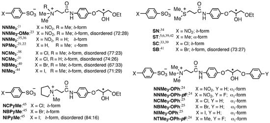 Molecular structure and crystal forms of the nonracemizable compounds showing preferential enrichment. Abbreviations of typical compounds are as follows: For ST, S stands for sulfonium ion and T represents p-toluenesulfonate group. For NNMe3, the first N stands for ammonium ion, the second N represents p-nitorobenzenesulfonate group, and the last Me3 indicates trimethyl-substituted ammonium structure. For NNMe3-OPh, OPh indicates the presence of a terminal phenoxy group in place of a terminal ethoxy group in NNMe3.