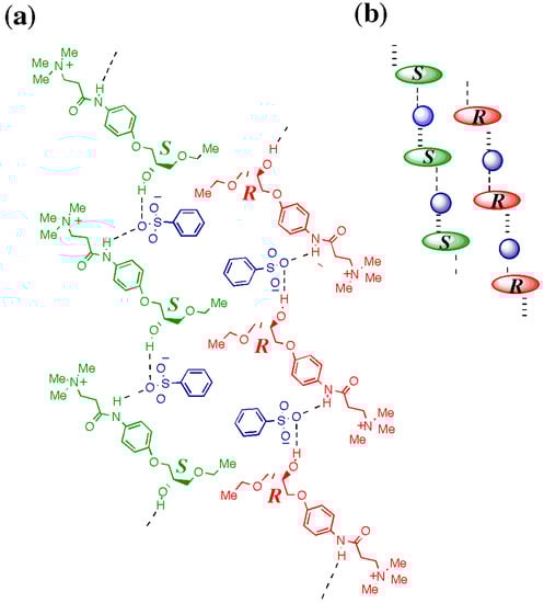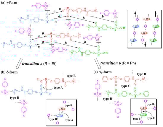 Polymorphic transition in the metastable γ-form crystal is initiated by rearrangement of the hydrogen bonds inside the crystal lattice. It is very possible for the nearest R and S molecules in the two adjacent chains in the γ-form to form new hydrogen bonds between the ethoxy oxygen atoms and the hydroxy groups by slight movement of the two molecules in the crystal. This rearrangement of hydrogen bonds, accompanied by slight movement of the sulfonate ions so as to form the cyclic dimers of types A and B, occurs one after another in the crystal lattice to lead to the heterochiral 1D chains and then the weak 2D sheet structure (Figure 11, Figure 12 and Figure 13).