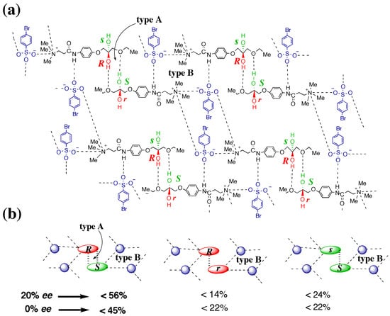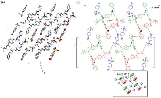 In the δ-form crystals of racemic and S-rich (20% ee) NBMe3 [], the orientational disorder was observed at the position of the hydroxy group on an asymmetric carbon atom (Figure 7). The degree of disorder per asymmetric unit (one salt) for the racemic or S-rich sample was estimated to be 67:33 or 75:25 (R vs. S, or S vs. R), respectively, by calculating the constrained occupancy factors of the hydroxy group, corresponding to a fairly ordered racemic mixed crystal. The δ-form crystal structure of racemic NBMe3 is characterized by two types of cyclic dimers, types A and B; the head-to-head cyclic dimer of type A is formed by the hydrogen bonds between the hydroxy groups and the ethoxy oxygen atoms in a pair of R and S molecules, and another head-to-head cyclic dimer of type B is formed by i) the hydrogen bond between one oxygen atom of a sulfonate ion and the amide NH and ii) the electrostatic interaction between another oxygen atom of the same sulfonate ion and the ammonium nitrogen atom in the neighboring long-chain cation (Figure 7). By virtue of these intermolecular interactions, a heterochiral 1D chain is formed. Furthermore, each 1D chain interacts with two adjacent chains by another weak electrostatic interaction between the third oxygen atom of the same sulfonate ion and the ammonium nitrogen atom in the adjacent chains, eventually forming a weak 2D sheet structure. This fragile 2D sheet structure is essential for crystal disintegration resulting in preferential enrichment as discussed in Section 3.4.