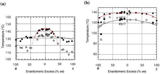 In the case of NNMe3, two curves were found to intersect at two points around 35% ee (Figure 9a). The X-ray crystallographic analyses indicated that the curve in the range of 0-15% ee corresponds to a highly or fairly ordered racemic mixed crystal []. On the other hand, the overall flat curve in the range of more than 40% ee proved to correspond to a less ordered racemic mixed crystal composed of different amounts of the R and S enantiomers in the crystal lattice.
