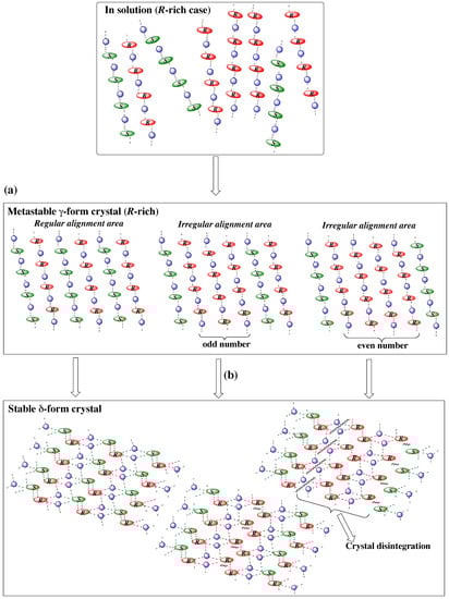 The proposed overall mechanism of preferential enrichment illustrated in Figure 10 is the case that a considerable enrichment of the R enantiomer occurs in the mother liquor by crystallization from the slightly R-rich (around 5% ee) supersaturated solution. In solution, homochiral 1D R and S chains are formed preferentially and aggregate to form a γ-form supramolecular cluster, which undergoes a phase transition to give the incipient metastable γ-form crystals with fair disorder. Since the R enantiomer is slightly in excess in solution, the resulting metastable γ-form crystals become slightly R-rich, too. This slightly R-rich crystals consist of three types of alignment modes of the homochiral R and S chains; the major regular alignment of the R and S chains, along with two minor irregular alignments in which an odd number of R chains or an even number of R ones are surrounded by two S chains. The next step is the polymorphic transition initiated by the rearrangement of the hydrogen bonds in the crystal lattice as discussed in the Section 3.4. After the polymorphic transition, partial crystal disintegration in the resulting δ-form crystals occurs at the sites where an even number of homochiral R chains are aligned between two S chains, releasing the R-rich area into solution. In contrast, at the sites where an even number of homochiral S chains are aligned between two R chains, the dissolution of the S-rich area into solution seemingly does not proceed; as soon as the dissolved S enantiomers form 1D S chains, they meet with excess 1D R chains in solution, and then crystallization of the R-rich γ-form crystals and the subsequent polymorphic transition into the δ-form occur, followed by redissolution of the excess R enantiomer into solution to result in the eventual deposition of slightly S-rich δ-form crystals. Thus, the ee value of the R enantiomer in the mother liquor is gradually raised until the opposite S enantiomer becomes in a small excess in the deposited crystals.