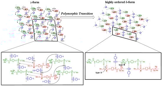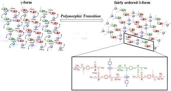 Polymorphic transition in the case where equal numbers of homochiral R and S chains are alternately aligned in the γ-form crystal, leading to the ordered δ-form crystal.