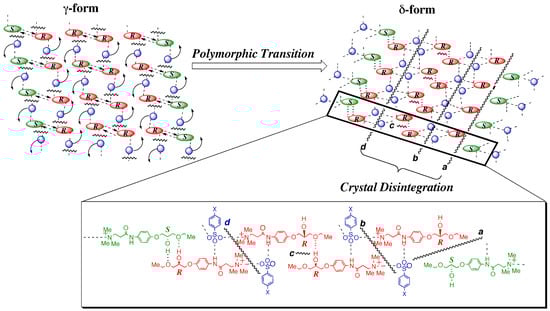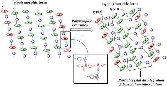 On the analogy of the mode of the polymorphic transition of the γ-form into the δ-form, we propose the mode of γ-to-α1 polymorphic transition (Figure 14) [,]. Polymorphic transition is initiated by rearrangement of the hydrogen bonds inside the γ-form crystal lattice. The nearest R and S molecules in the two adjacent chains in the γ-form form new hydrogen bonds between the hydroxy group and the carbonyl oxygen atom by slight movement of the two molecules inside the crystal lattice to give a cyclic dimer of type C (Figure 14c). This molecular movement occurs in an opposite direction to the case of the γ-to-δ transition, where new hydrogen bonds are formed between the hydroxy groups and the alkoxy oxygen atoms to give a cyclic dimer of type A (Figure 14b) [,]. Namely, the terminal phenoxy group prevents the γ-to-δ transition a due to the steric hindrance, instead the γ-to-α1 transition b occurs. Subsequently, this rearrangement of hydrogen bonds, accompanied by slight movement of the phenylsulfonate groups so as to form cyclic dimers of types B and C, occurs one after another in the crystal lattice and leads to the heterochiral 1D chains and then the weak 2D sheet structure (Figure 8). In an area where an even number of homochiral S (R) chains are surrounded by two R (S) chains in the γ-form crystal, partial crystal disintegration occurs after polymorphic transition, resulting in the occurrence of preferential enrichment (Figure 15).