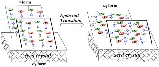Schematic representation of epitaxial transition of a metastable γ-form polymorph into an α1-form one on the surface of an α1-form seed crystal, inducing preferential enrichment.