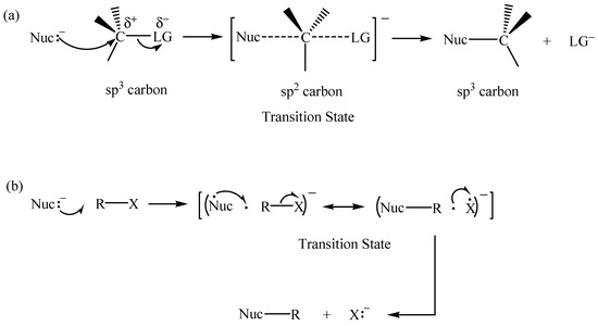 (a) Nucleophilic attack on the partially positively charged sp3 hybridized carbon in a functionalized molecule forming a transition state with the central carbon sp2 hybridized. (b) Nucleophilic attack on a functionalized molecule forming a postulated transition state containing a delocalized one-electron intermolecular bond (See ref. [7]).