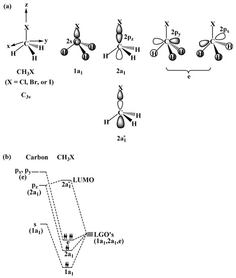 A halomethane molecule CH3X (X = Cl, Br, or I) possesses the C3v symmetry. Its principal three-fold axis is along the C–X bond. Therefore, this direction is defined as z-axis (Figure 2a). The carbon atom in the molecule can be regarded as the central atom, while the three hydrogen and halogen atoms are considered four ligands coordinating to the central carbon atom. According to molecular orbital theory, the linear combination of the four ligand orbitals forms four molecular orbitals called ligand group orbitals (LGO’s) [12]. Then bonding in CH3X can be treated by further linear combination of LGO’s with valence orbitals in the central carbon atom (2s, 2px, 2py, and 2pz) based on symmetry-match, forming a set of molecular orbitals (MO’s). This method has been widely used in transition metal coordination compounds [12] as well as in tetracoordinated, pentacoordinated, and hexacoordinated main group compounds [13,14,15].