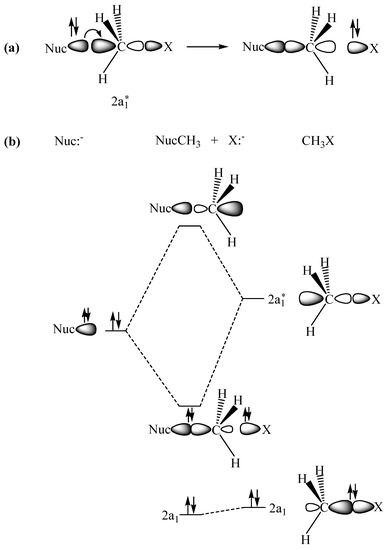 (a) Maximum overlap of a nucleophile orbital with the 2pz-based LUMO 2a1* in the opposite side of the leaving group –X in CH3X (X = Cl, Br, or I) results in electron transfer to 2a1* breaking the C–X bond and effecting an SN2 reaction. (b) Correlations of frontier molecular orbitals for the SN2 reaction of CH3X.