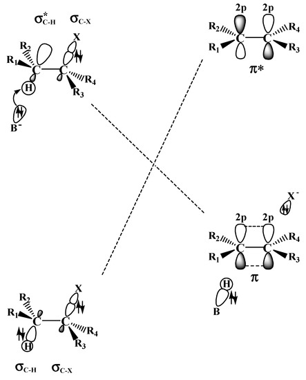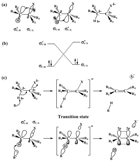 (a) Anti-coplanar arrangement of the Cα–X and Cβ–H bonds in a haloalkane molecule (X = Cl, Br, or I; R1, R2, R3, R4 = H or alkyl) in staggered conformation. Bonding and antibonding molecular orbitals for the anti-coplanar Cα–X and Cβ–H bonds. (b) Effective interactions (partial overlap) of the molecular orbitals for the Cα–X and Cβ–H bonds due to symmetry-match. (c) Proposed interactions and transformations of reacting molecular orbitals in the course of an E2 reaction. The configuration (geometry) of the transition state has been established earlier [16,17].