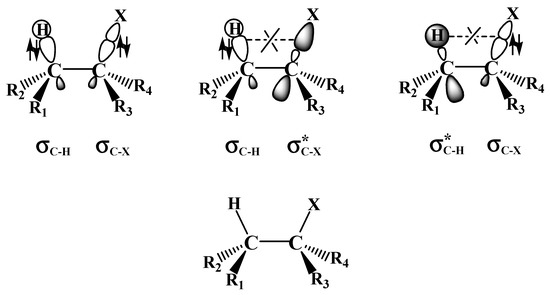 Syn-coplanar arrangement of the Cα–X and Cβ–H bonds in a haloalkane molecule in eclipsed conformation. Bonding and antibonding molecular orbitals for the syn-coplanar Cα–X and Cβ–H bonds.