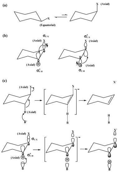 Figure 7 shows that the axial Cα–X bonding (σC-X) orbital (filled) and the axial Cβ–H antibonding (σC-H*) orbital (empty) are of symmetry-match and they can partially overlap each other. The axial Cβ–H bonding (σC-H) orbital (filled) and the axial Cα–X antibonding (σC-X*) orbital (empty) are of symmetry-match and they can partially overlap each other. As seen in the case of the chain-like haloalkanes, the interaction (partial overlap) of the filled σC-H and empty σC-X* orbitals increases the electron density in σC-X* weakening the C–X bond and easing the leave of the halo (–X) group. The interaction (partial overlap) of the filled σC-X and empty σC-H* orbitals increases the electron density in σC-H* weakening and polarizing the C–H bond and making the β–H slightly acidic. As a result, the β–H can be effectively attacked by a base (B-) on the σC-H* antibonding orbital (Figure 7c) leading to a concerted E2 elimination reaction.