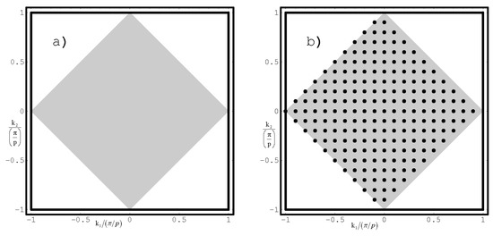 a) The Brillouin zone (B.Z.) associated with the infinite absolute point lattice. The vectors label the eigenfunctions of the group of translations in this infinite point lattice. The grey square indicates the corresponding B.Z. of the sublattices. The length of its side is . b) The grid of points shows the discrete character of the B.Z. when the absolute point lattice is finite with periodic conditions fixed in its boundaries. The unit of the scale means .